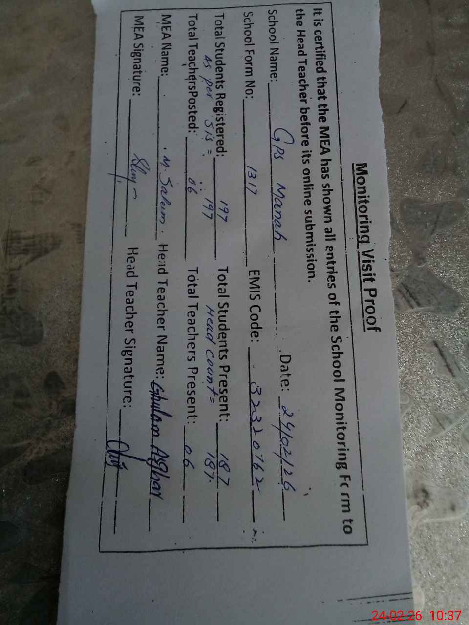 | Attendance Register | Head Teacher | MEA with School | Visit Proof |