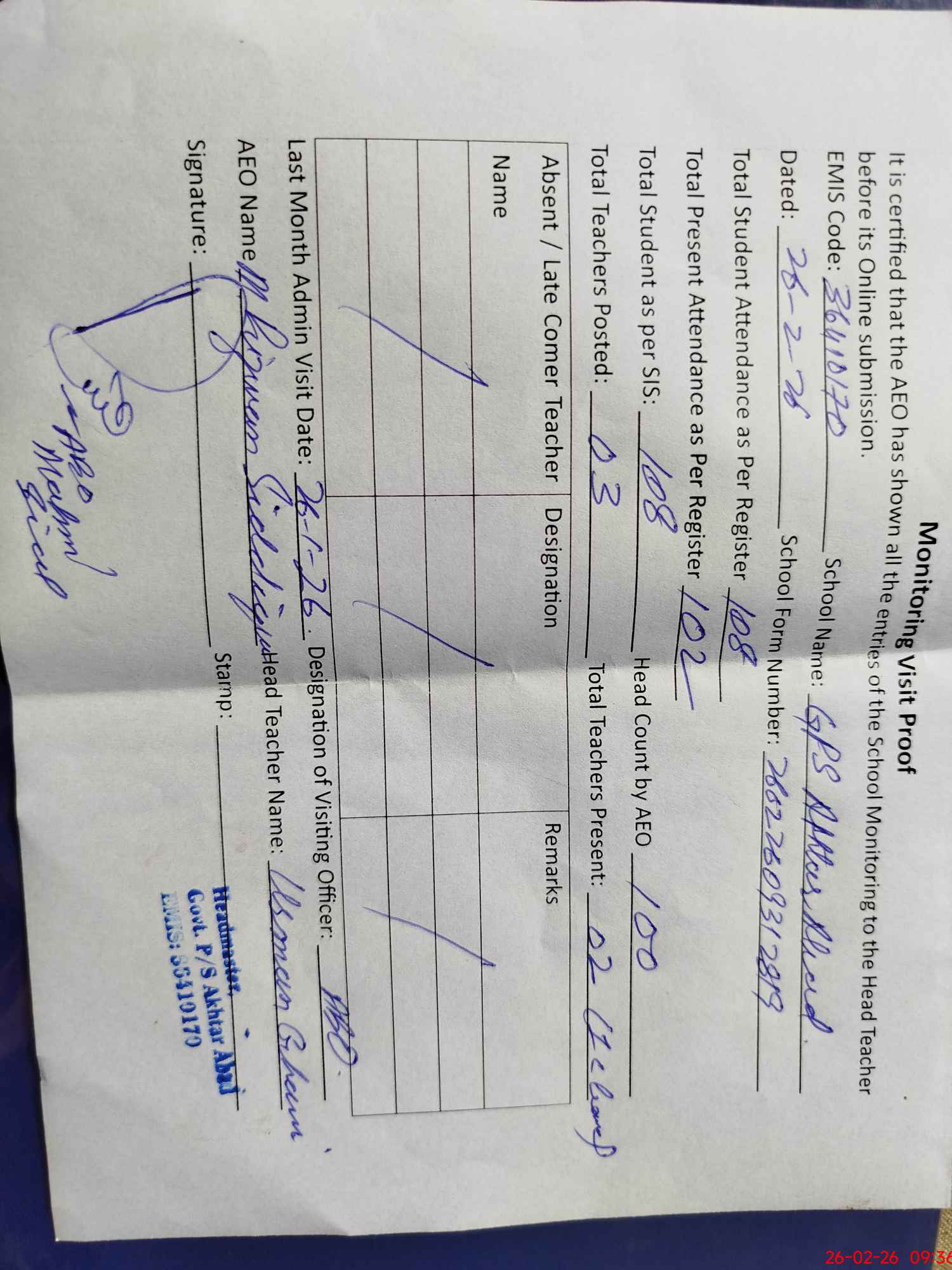 | EMIS Code: 36410170 | Name of School: GPS AKHTAR ABAD, P/O MAHNI SIAL, KABIRWALA | |||