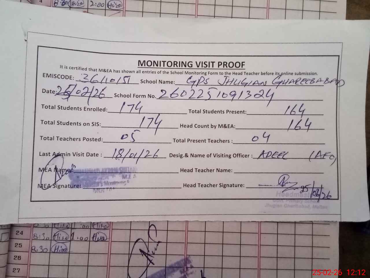 | Attendance Register | Head Teacher | MEA with School | Visit Proof |