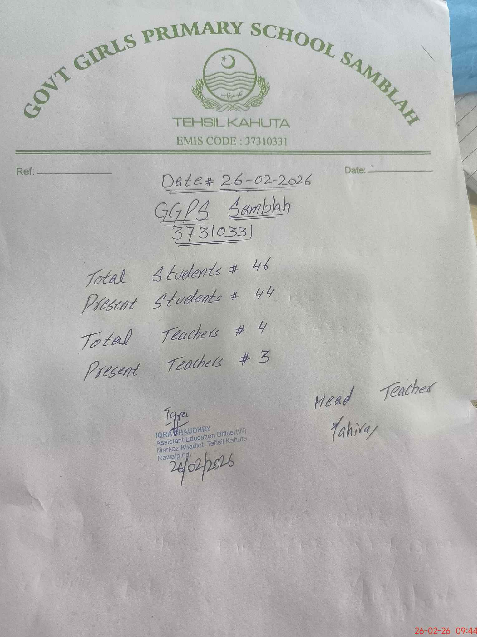 | District: RAWALPINDI | Tehsil: KAHUTA | Markaz: KHADIOT - FEMALE | Level: Primary | |
