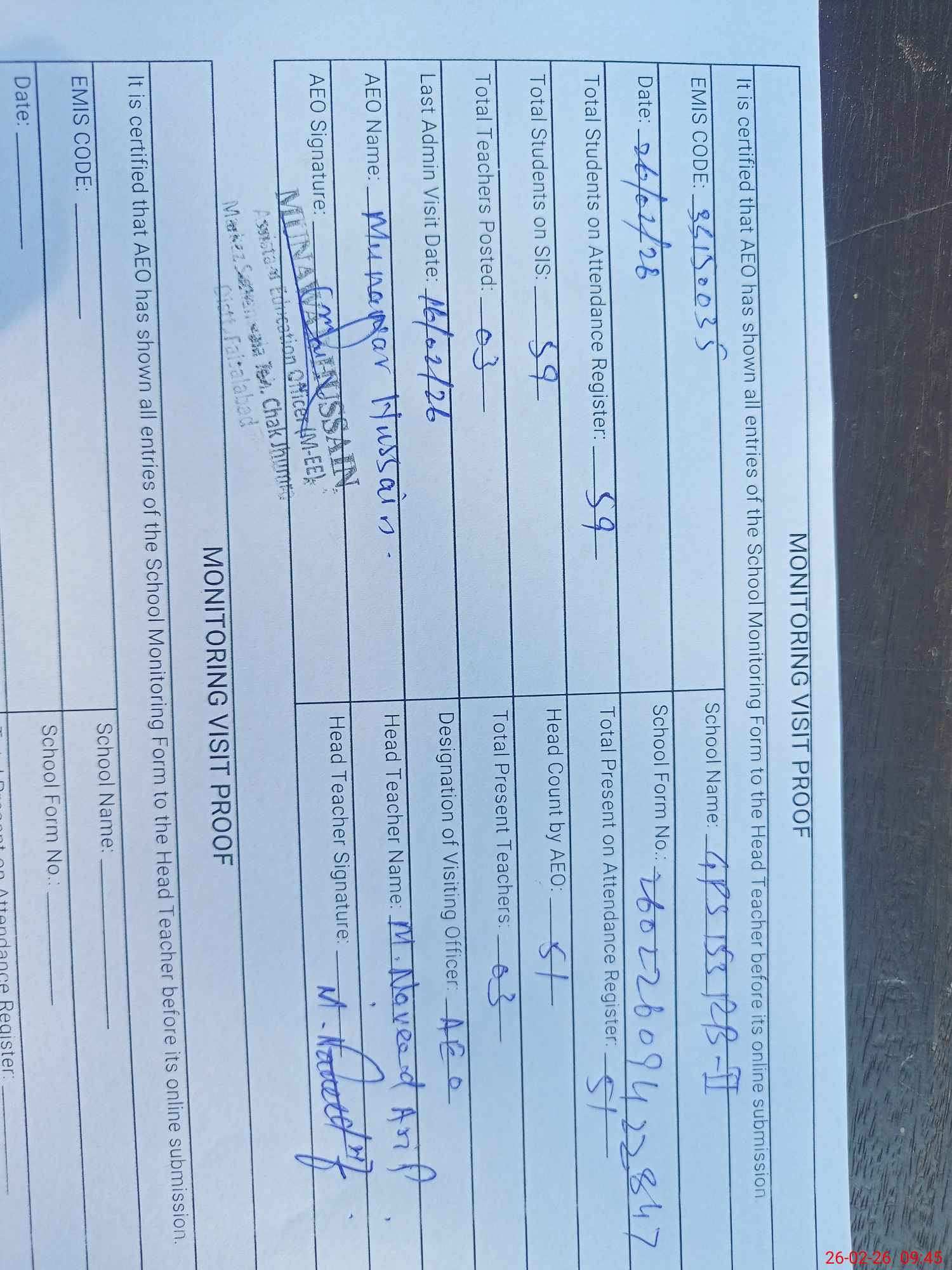 | Certified that this School was Inspected by the Undersigned MEA/DMO Today and the Information Stated Above is as Per Record. | |||||