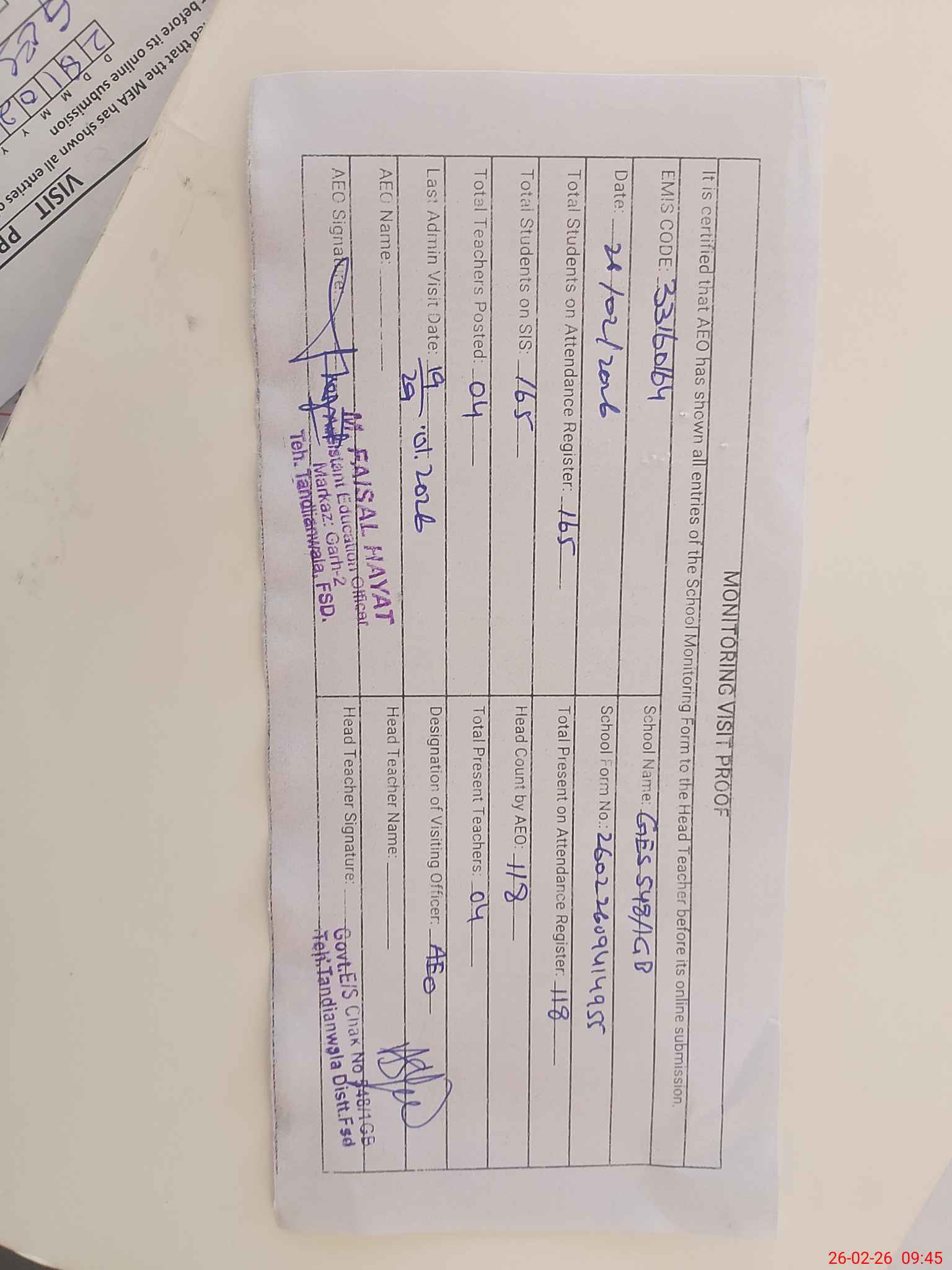 | Monitoring Date: 26-02-2026 | Start Time: 26-02-2026 09:23 AM | End Time: 26-02-2026 09:47 AM | Name of MEA: Mu**** Fa**** Ha**** | |