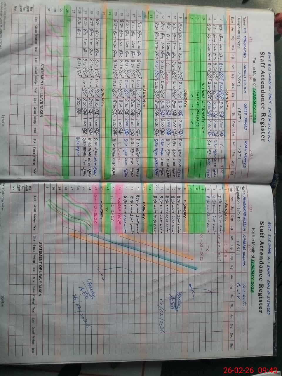 | CNIC | Full Name | Designation | R/C | Absence During Last Calender Month |
