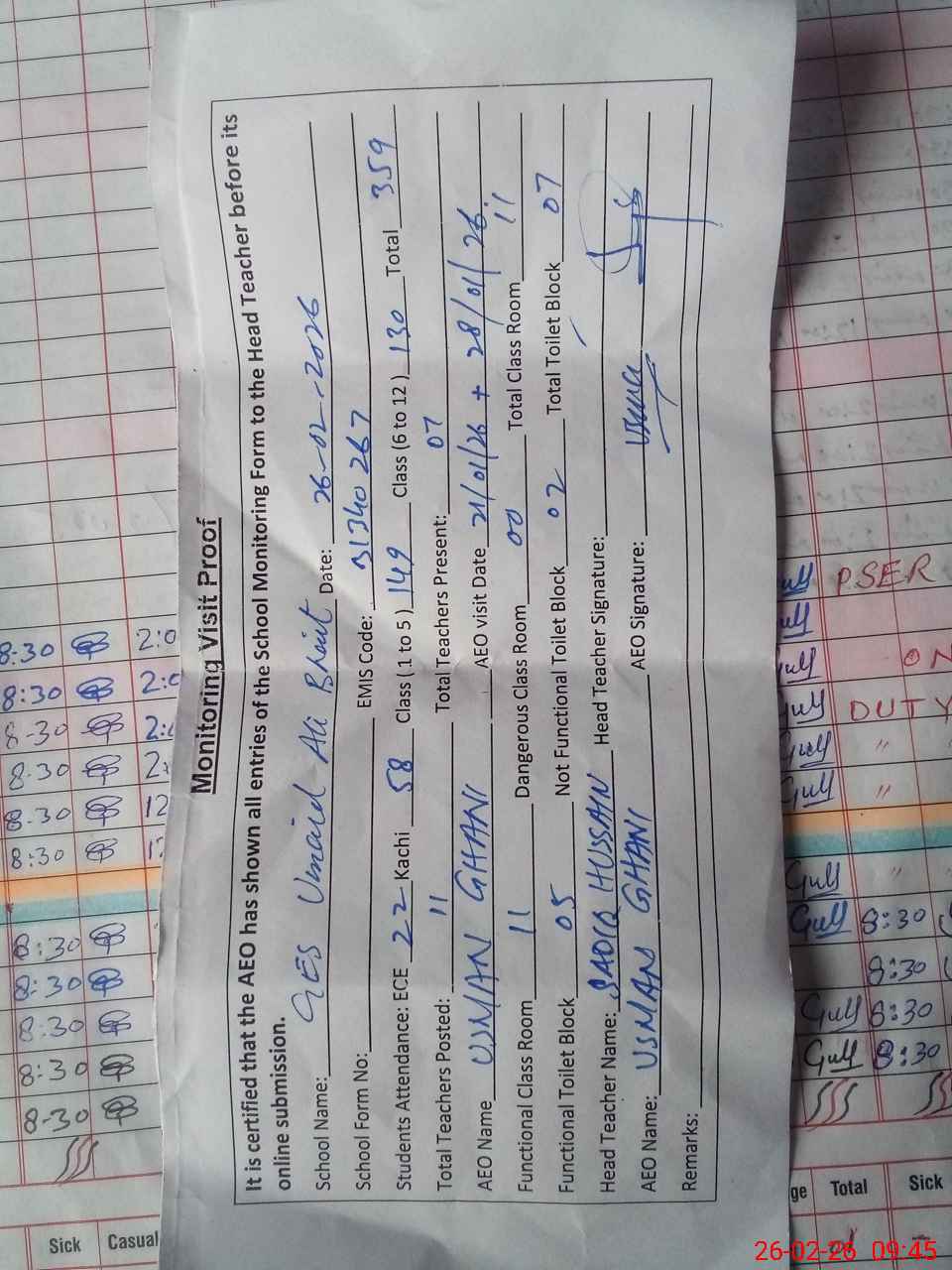 | Monitoring Date: 26-02-2026 | Start Time: 26-02-2026 08:51 AM | End Time: 26-02-2026 09:46 AM | Name of MEA: Us**** Gh**** | |