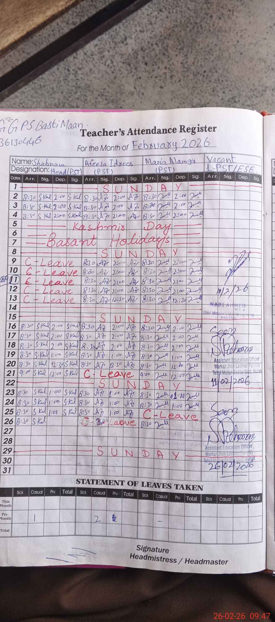 | EMIS Code: 36130446 | Name of School: GGPS BASTI MAAN WALA MULTAN | |||