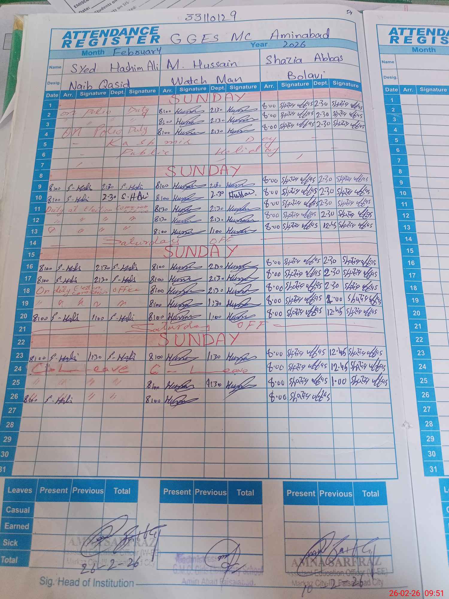 | CNIC | Full Name | Designation | R/C | Absence During Last Calender Month |