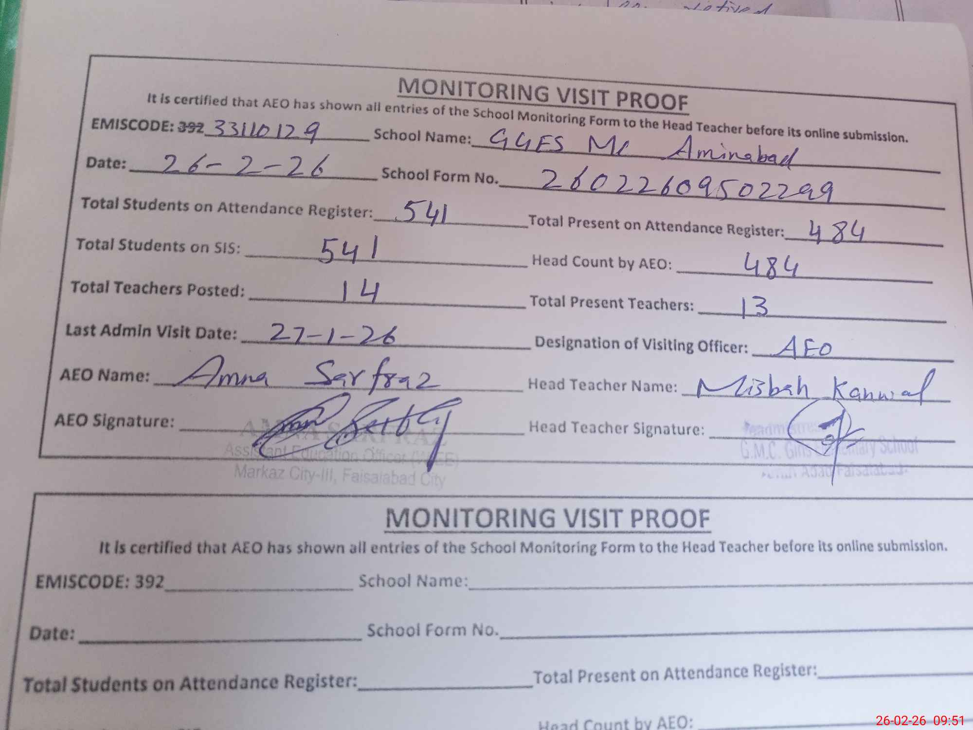 | Monitoring Date: 26-02-2026 | Start Time: 26-02-2026 09:35 AM | End Time: 26-02-2026 09:51 AM | Name of MEA: AM**** SA**** | |