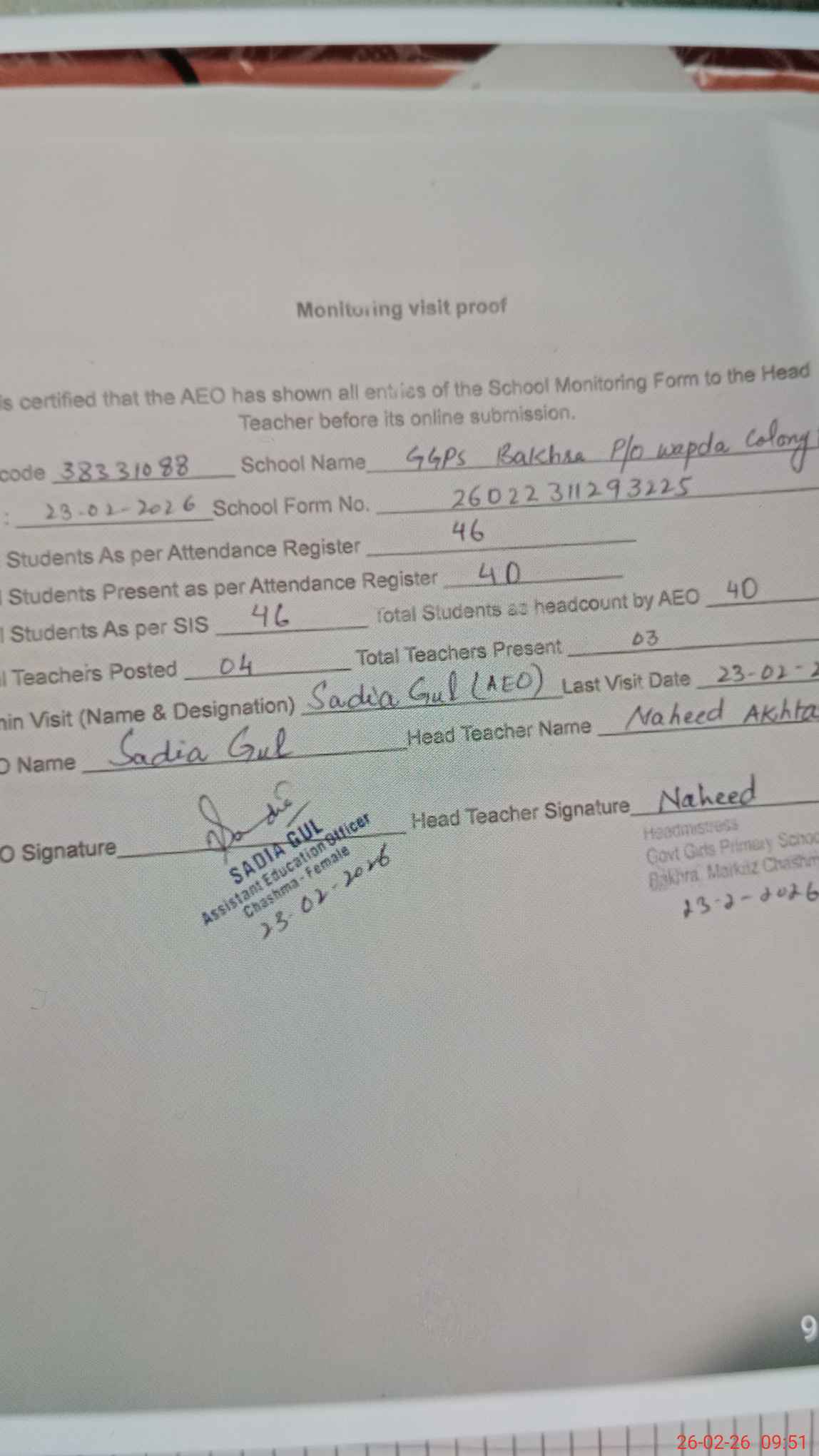 | Attendance Register | Head Teacher | MEA with School | Visit Proof |