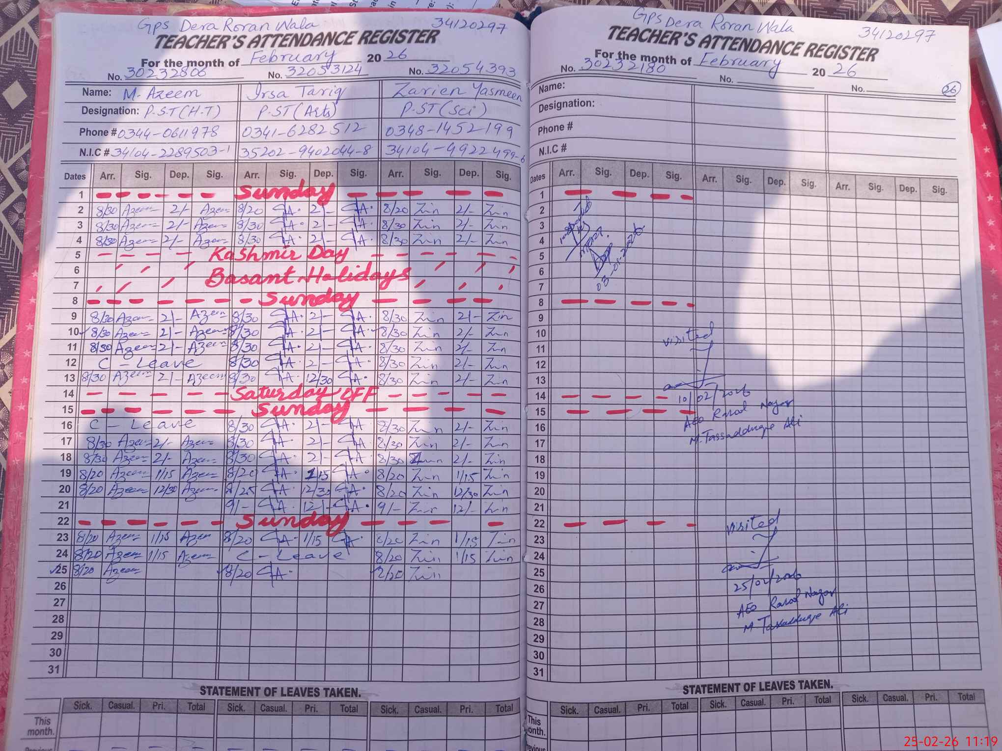 | CNIC | Full Name | Designation | R/C | Absence during last cal. month |