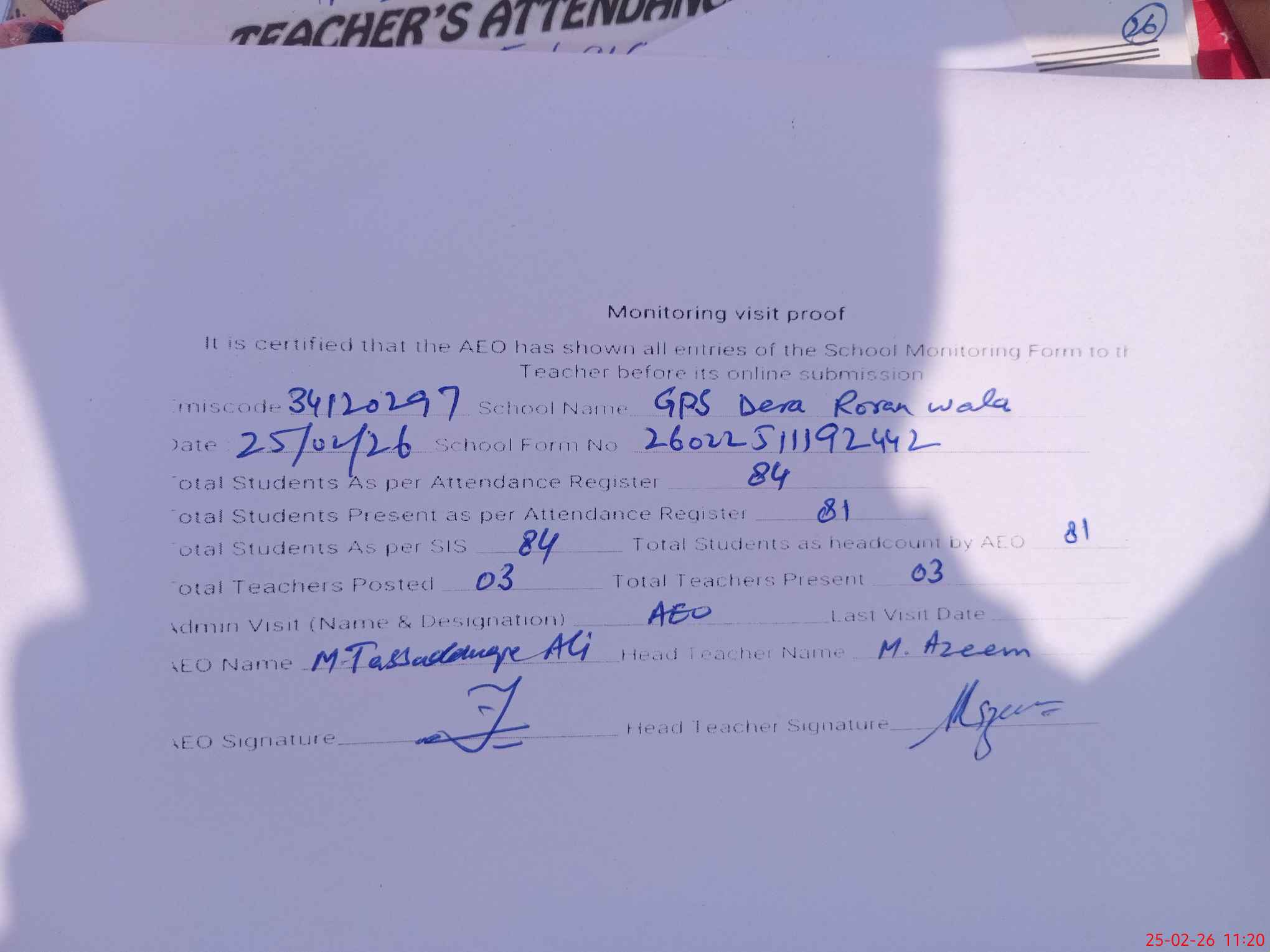 | Attendance Register | Head Teacher | MEA with School | Visit Proof |