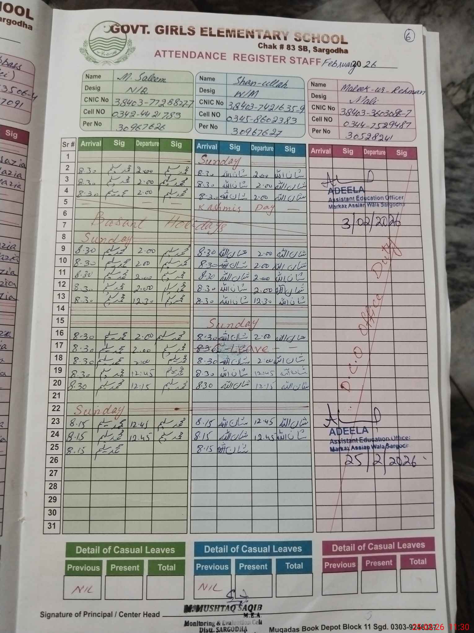 | CNIC | Full Name | Designation | R/C | Absence during last cal. month |