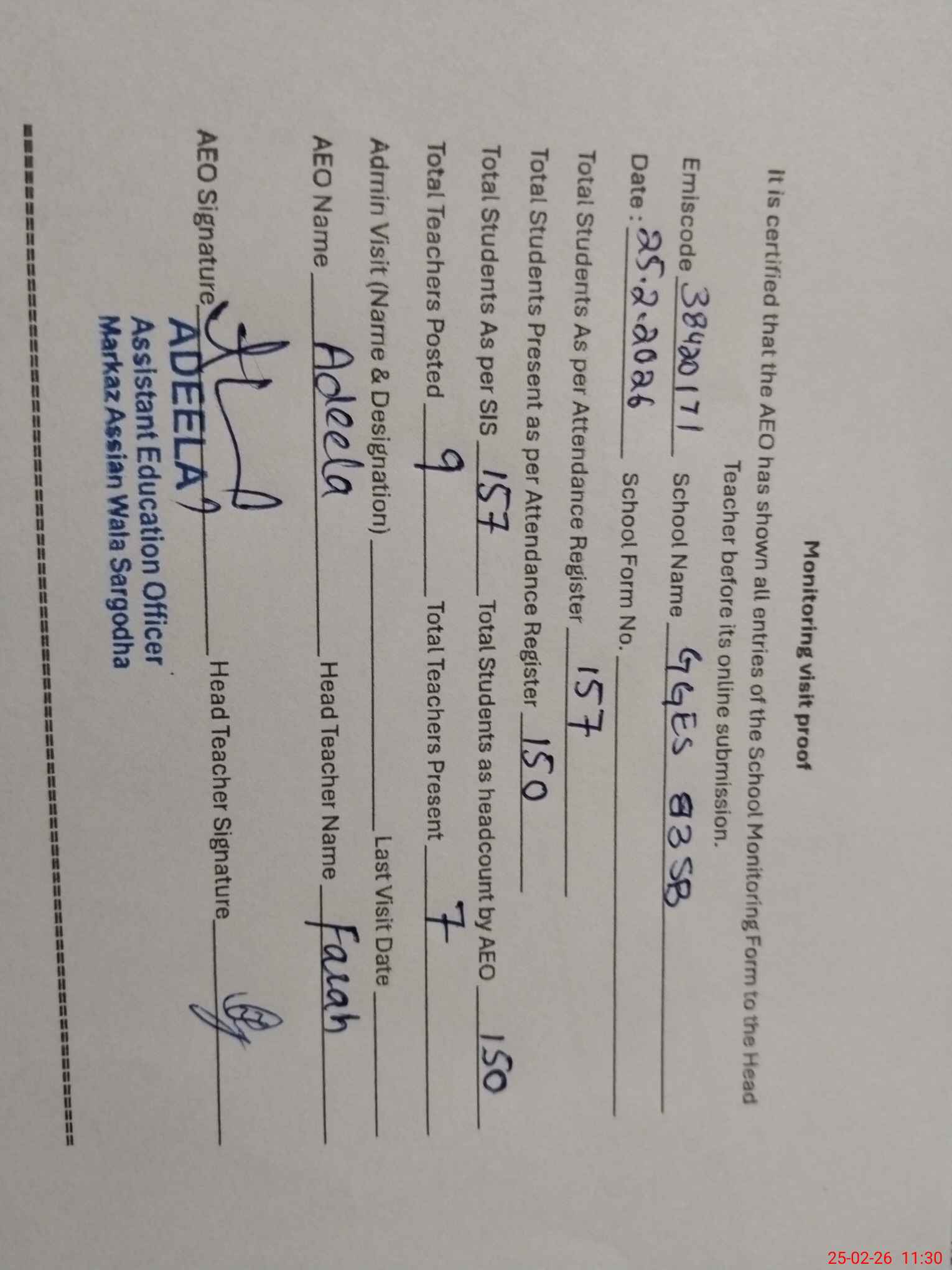 | Attendance Register | Head Teacher | MEA with School | Visit Proof |