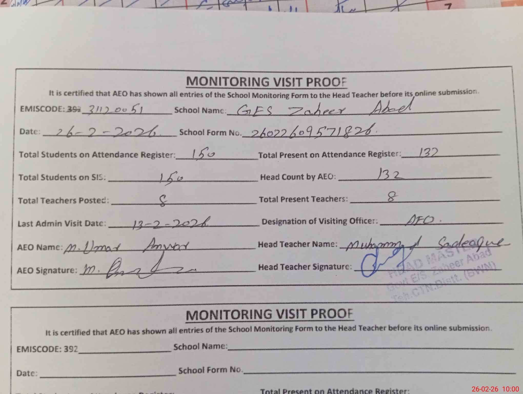 | Attendance Register | Head Teacher | MEA with School | Visit Proof |