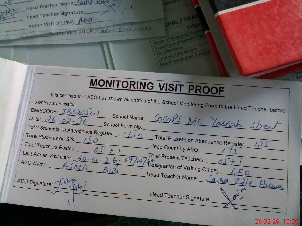| Attendance Register | Head Teacher | MEA with School | Visit Proof |