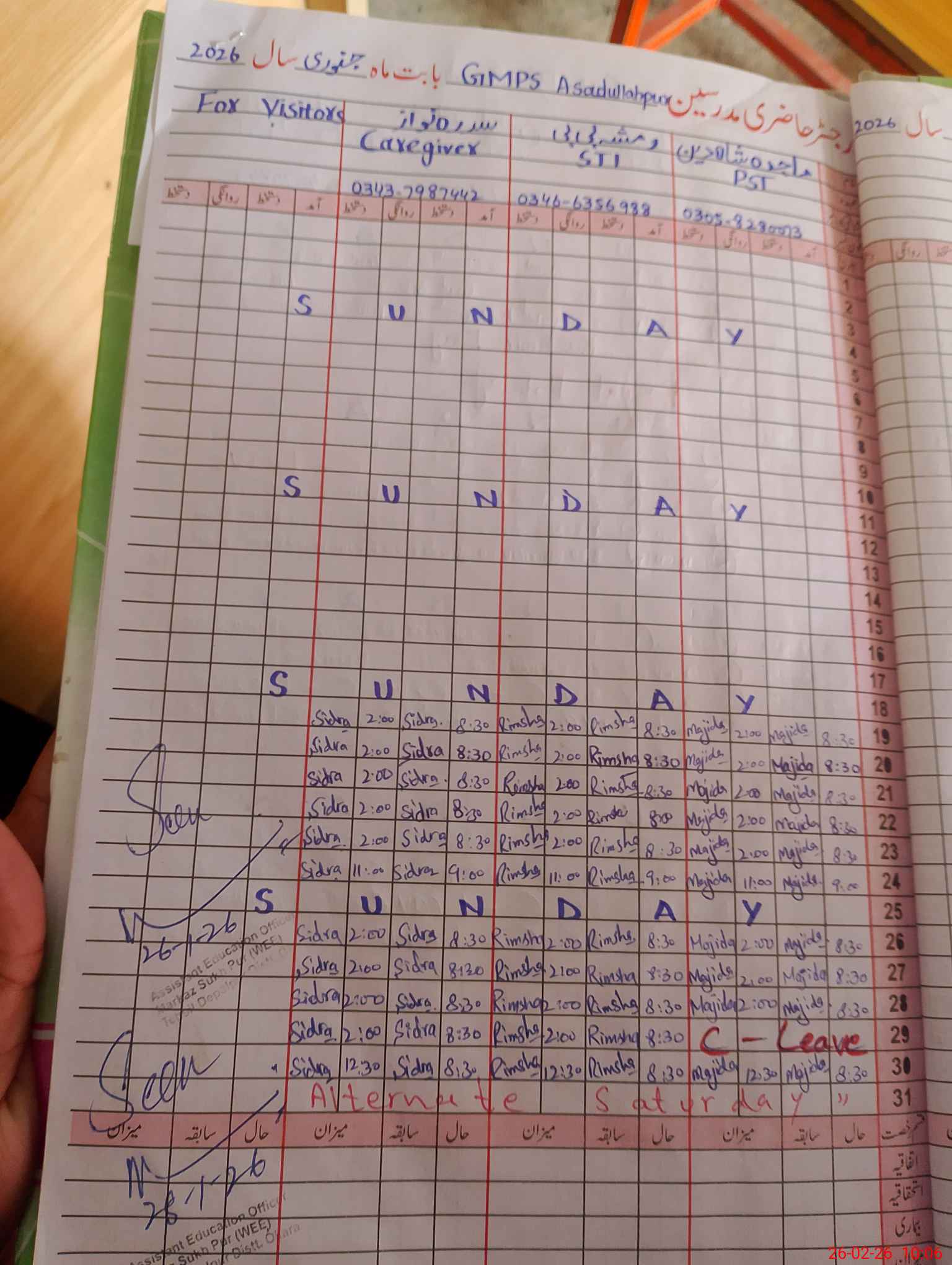 | Leave | Duty | Absent | Maternity | Medical | Ex- Pak |