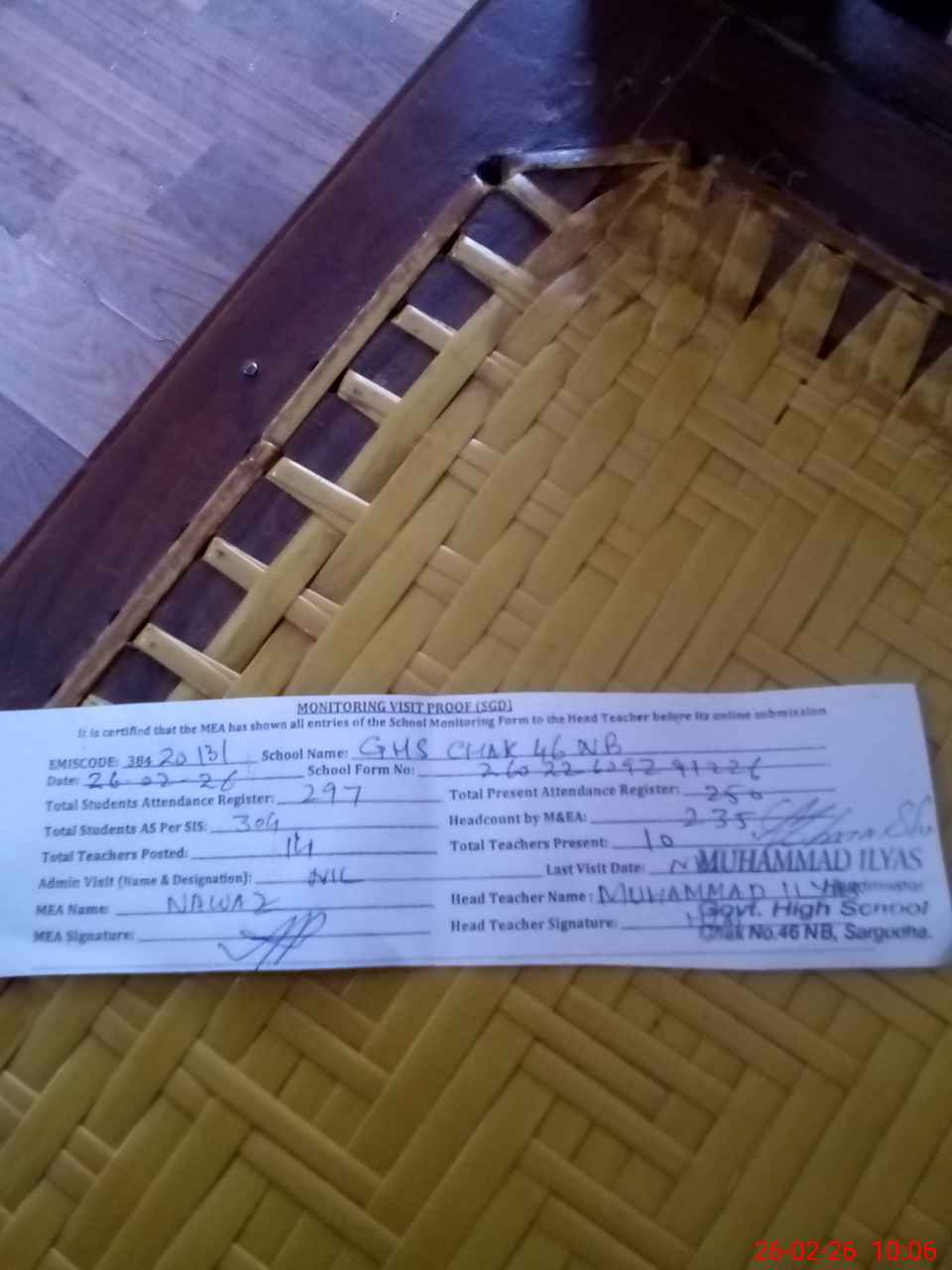 | Certified that this School was Inspected by the Undersigned MEA/DMO Today and the Information Stated Above is as Per Record. | |||||