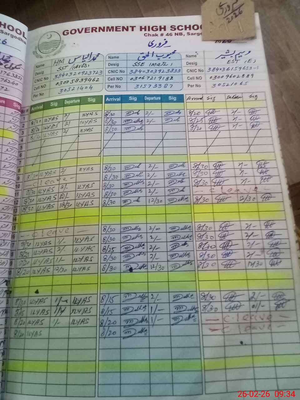 | CNIC | Full Name | Designation | R/C | Absence during last cal. month |