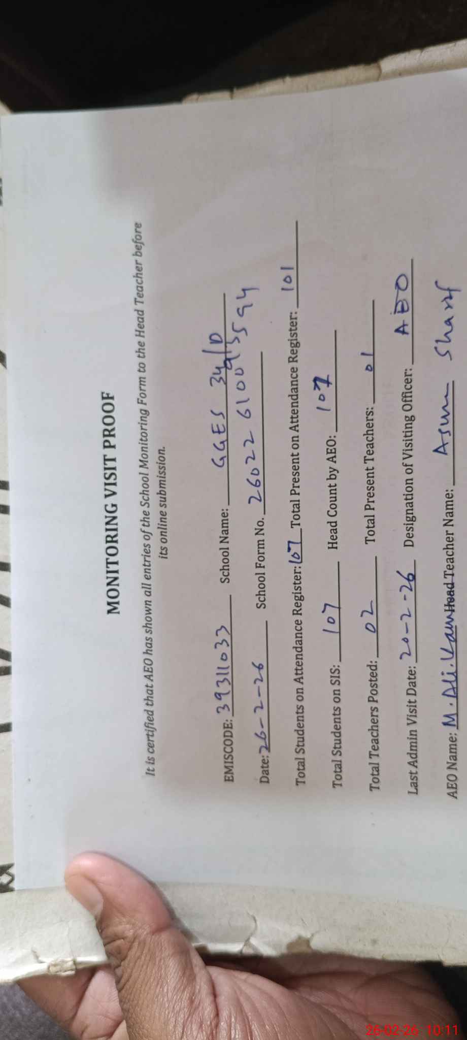 | Attendance Register | Head Teacher | MEA with School | Visit Proof |