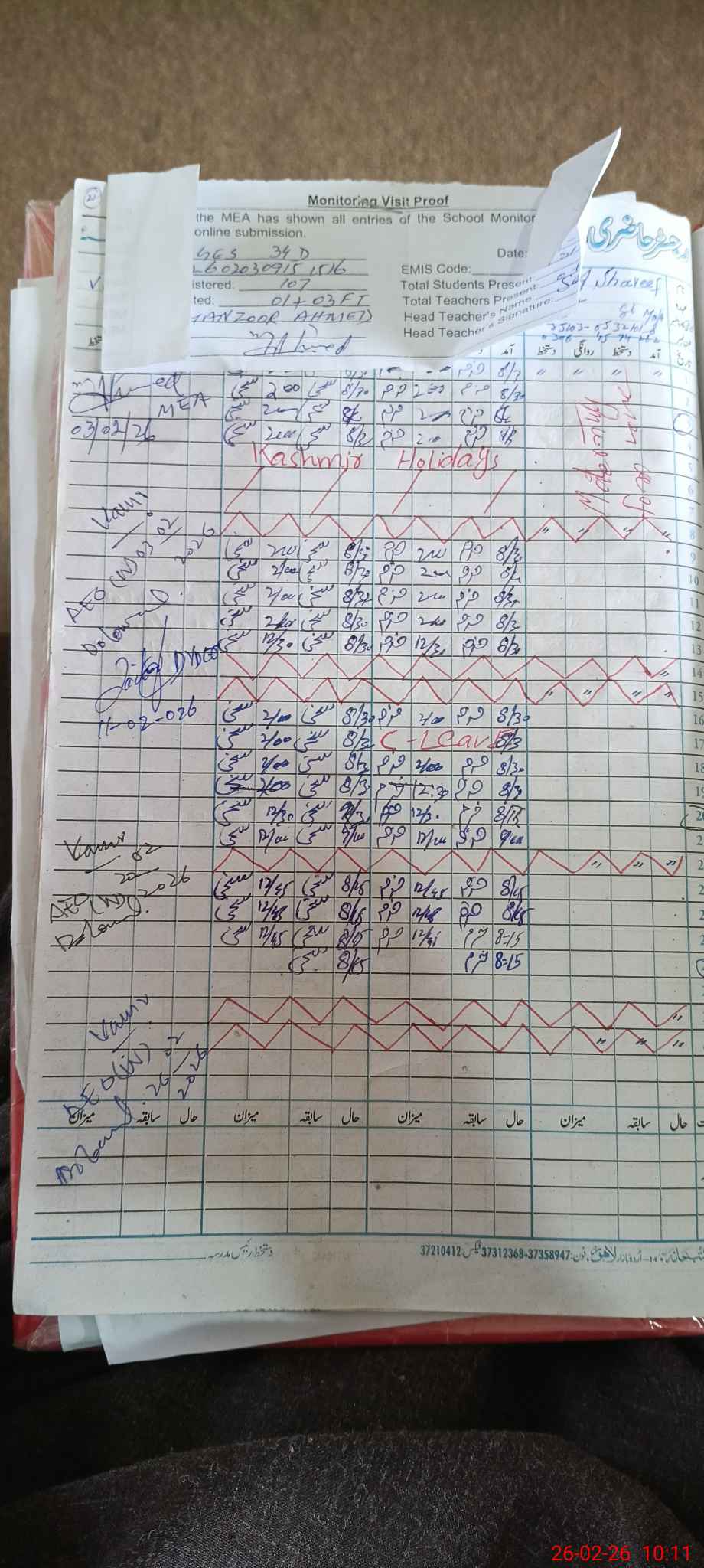 | Monitoring Date: 26-02-2026 | Start Time: 26-02-2026 09:38 AM | End Time: 26-02-2026 10:12 AM | Name of MEA: Mu**** Al**** Ka**** | |
