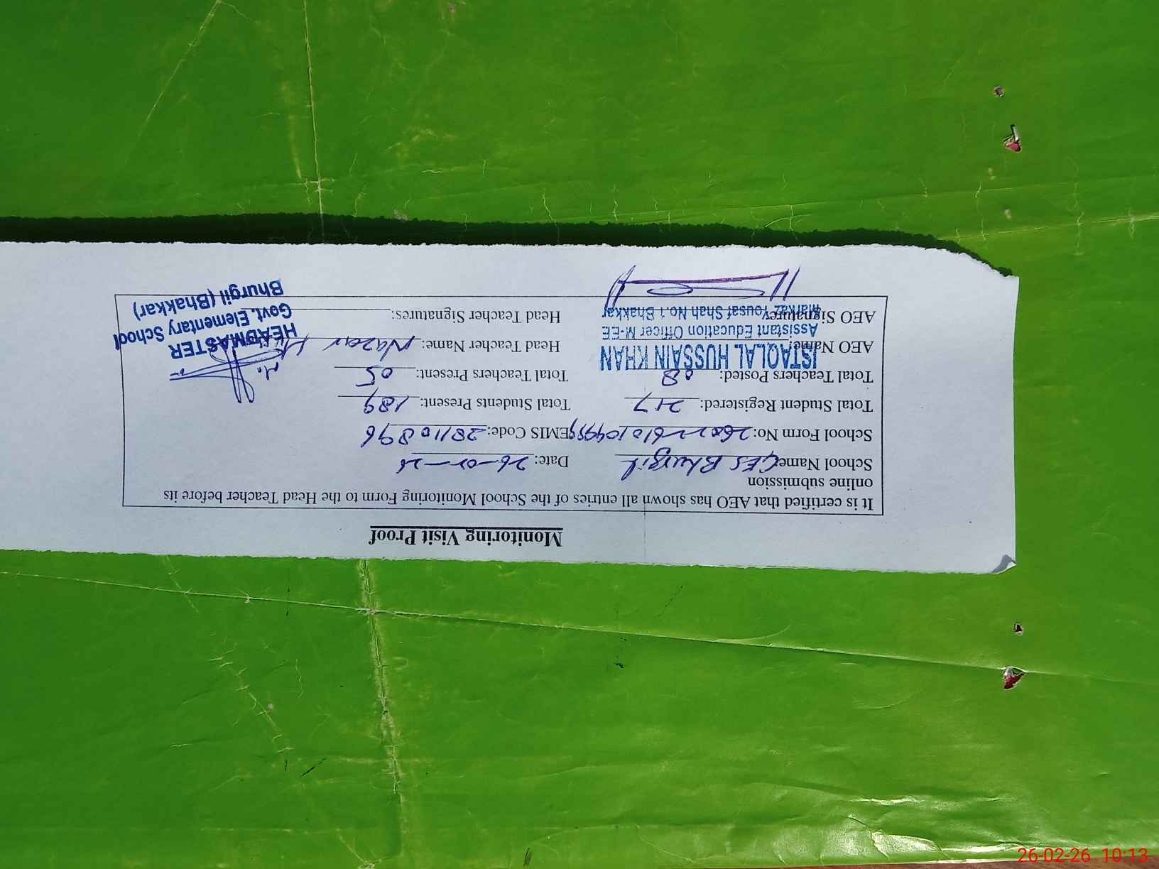| Certified that this School was Inspected by the Undersigned MEA/DMO Today and the Information Stated Above is as Per Record. | |||||