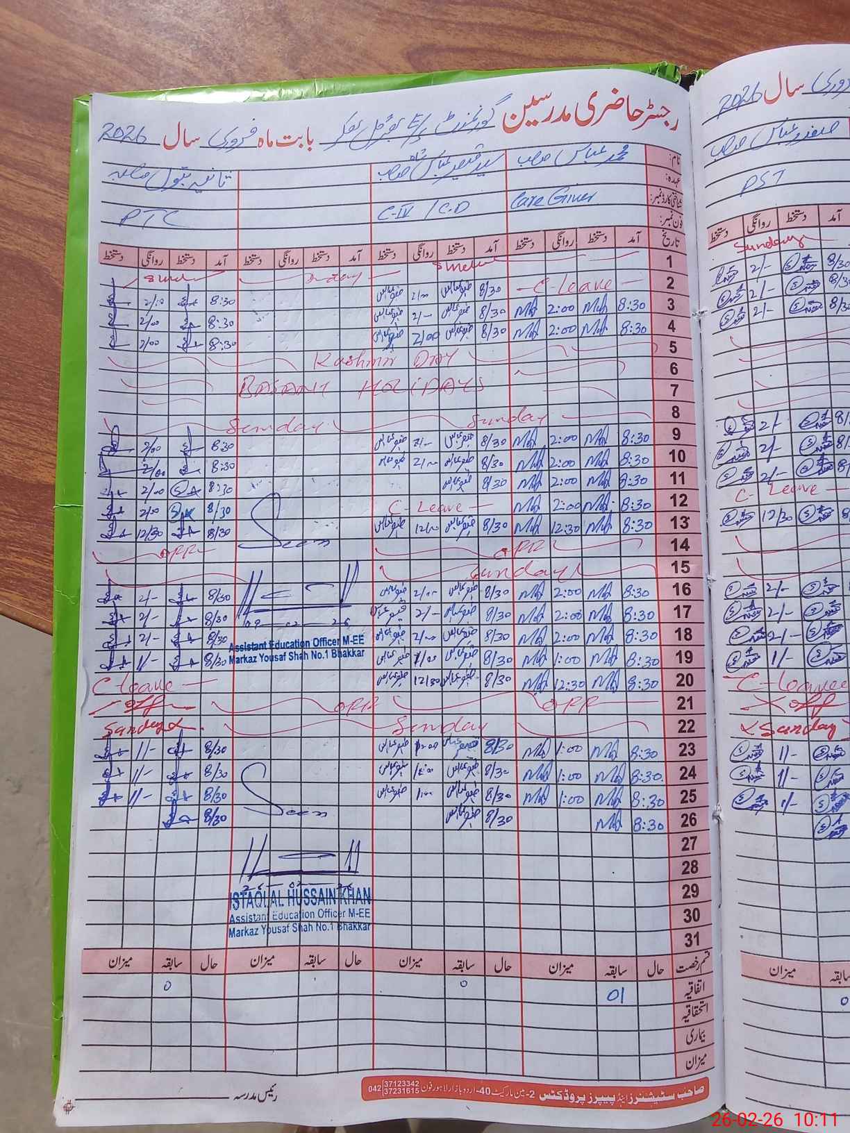 | CNIC | Full Name | Designation | R/C | Absence During Last Calender Month |