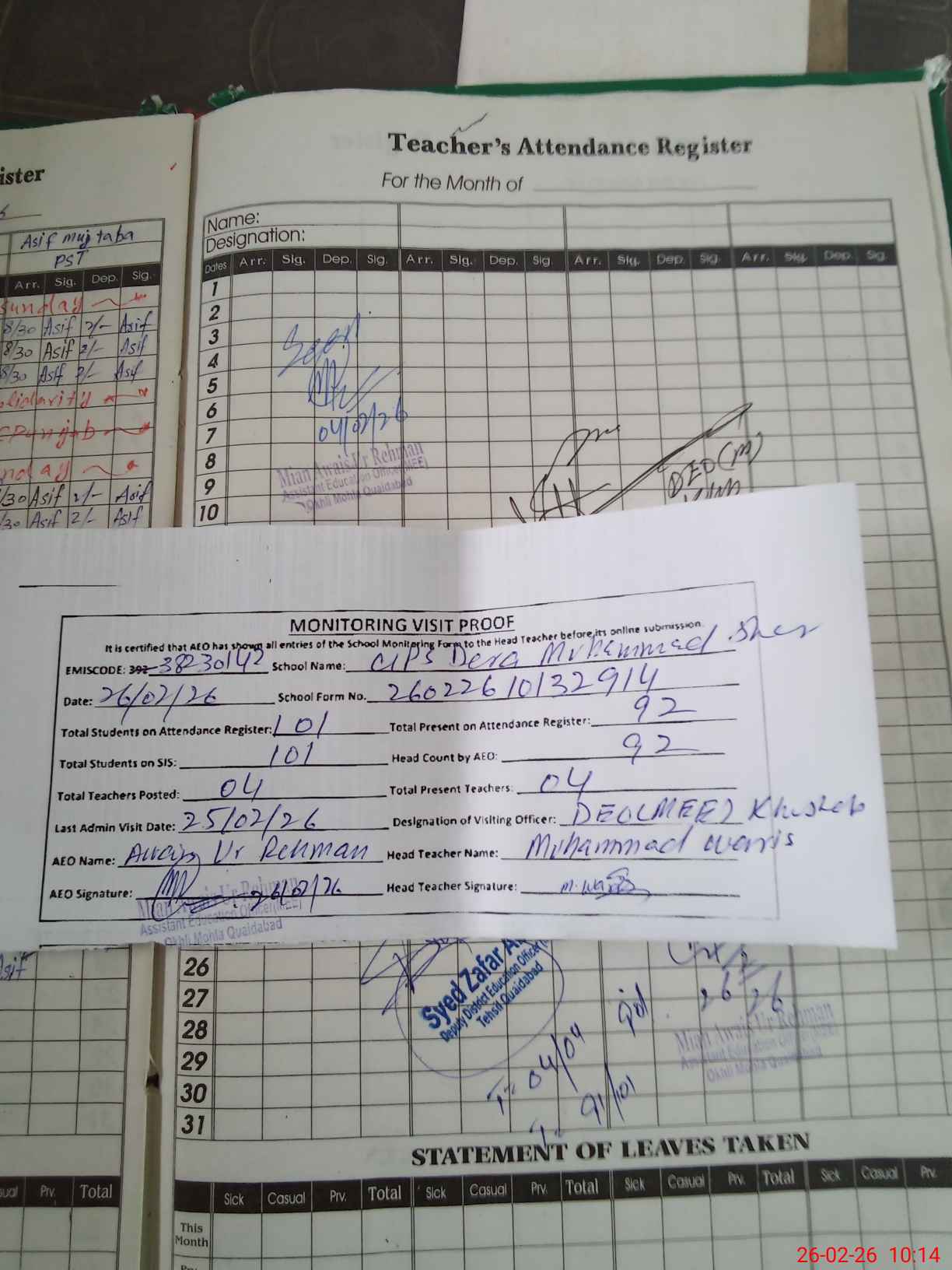 | Attendance Register | Head Teacher | MEA with School | Visit Proof |