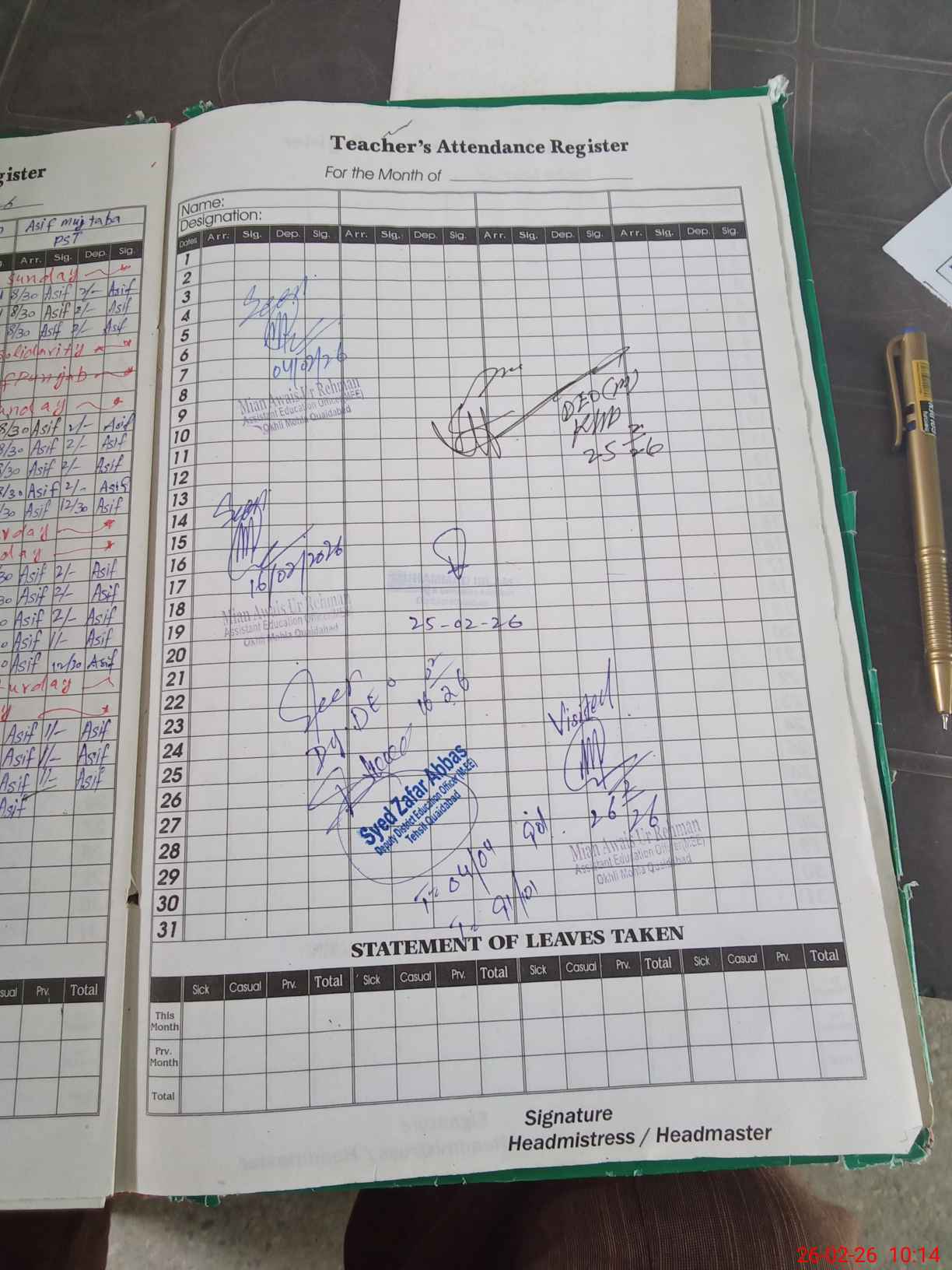| Leave | Duty | Absent | Maternity | Medical | Ex- Pak |