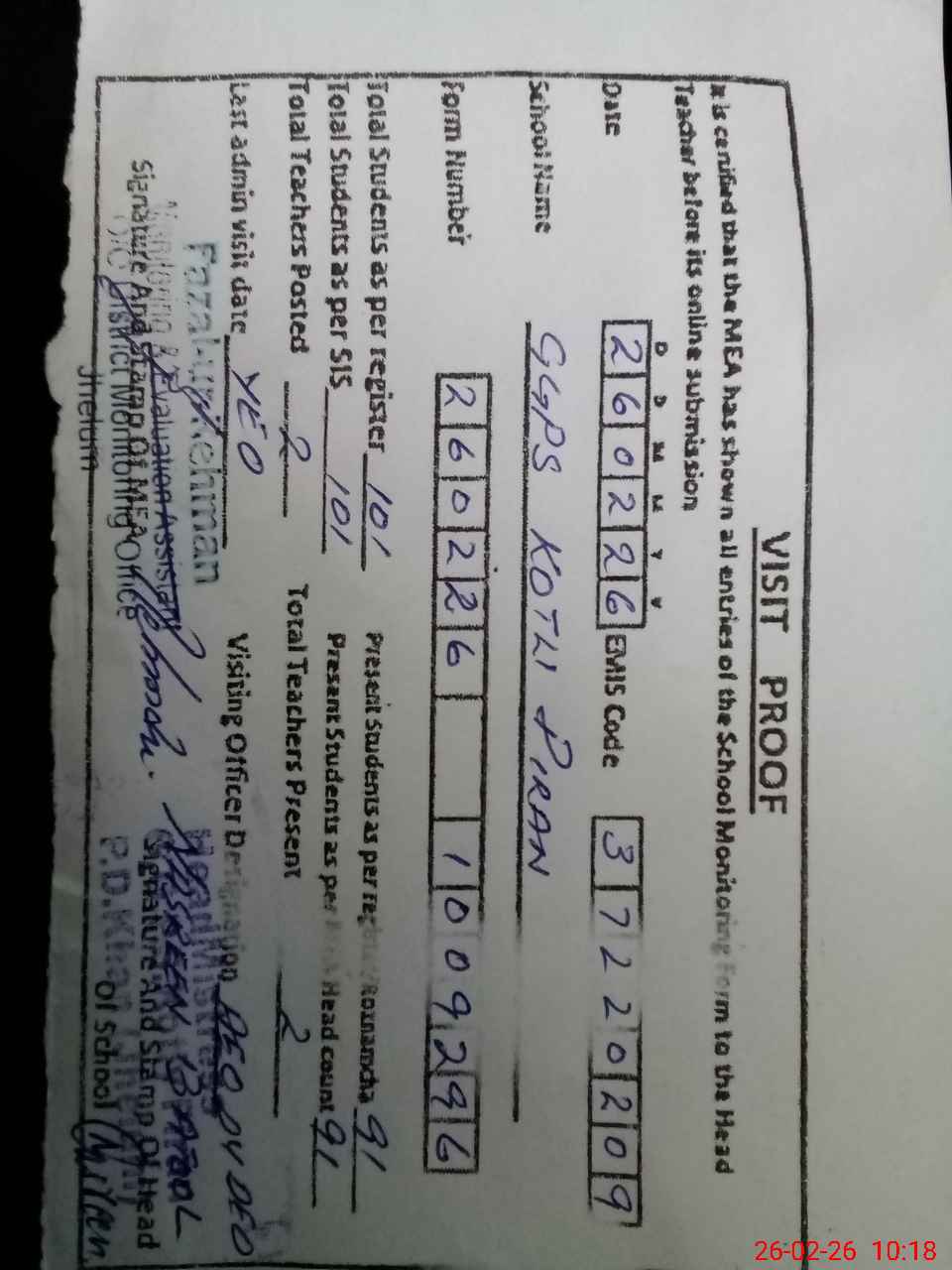 | Attendance Register | Head Teacher | MEA with School | Visit Proof |