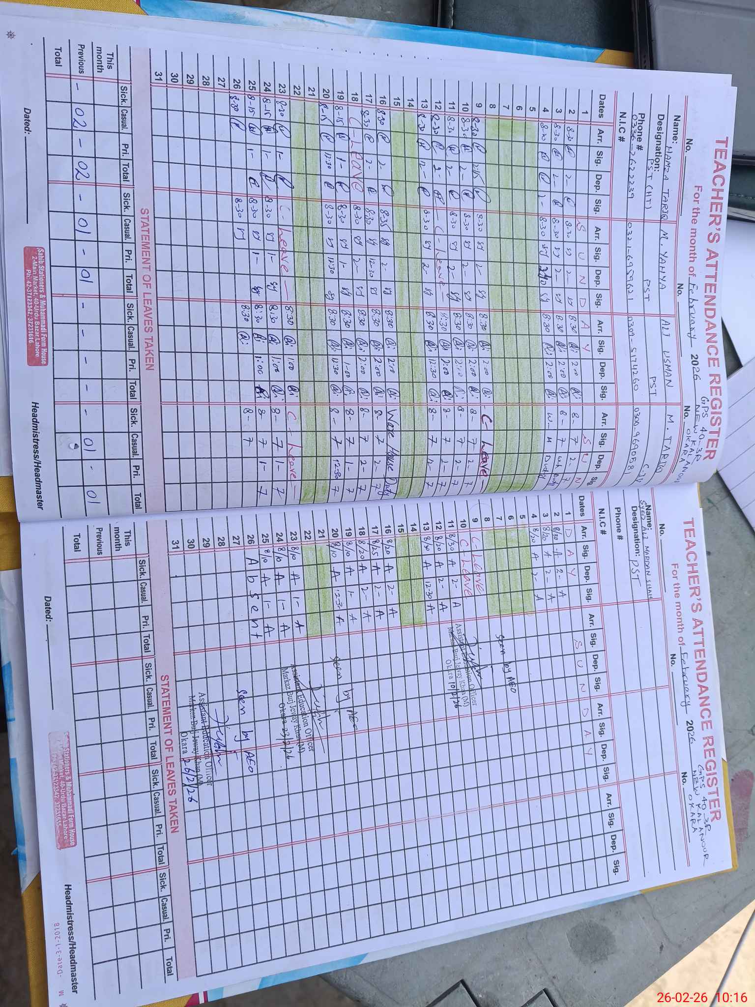 | CNIC | Full Name | Designation | R/C | Absence During Last Calender Month |