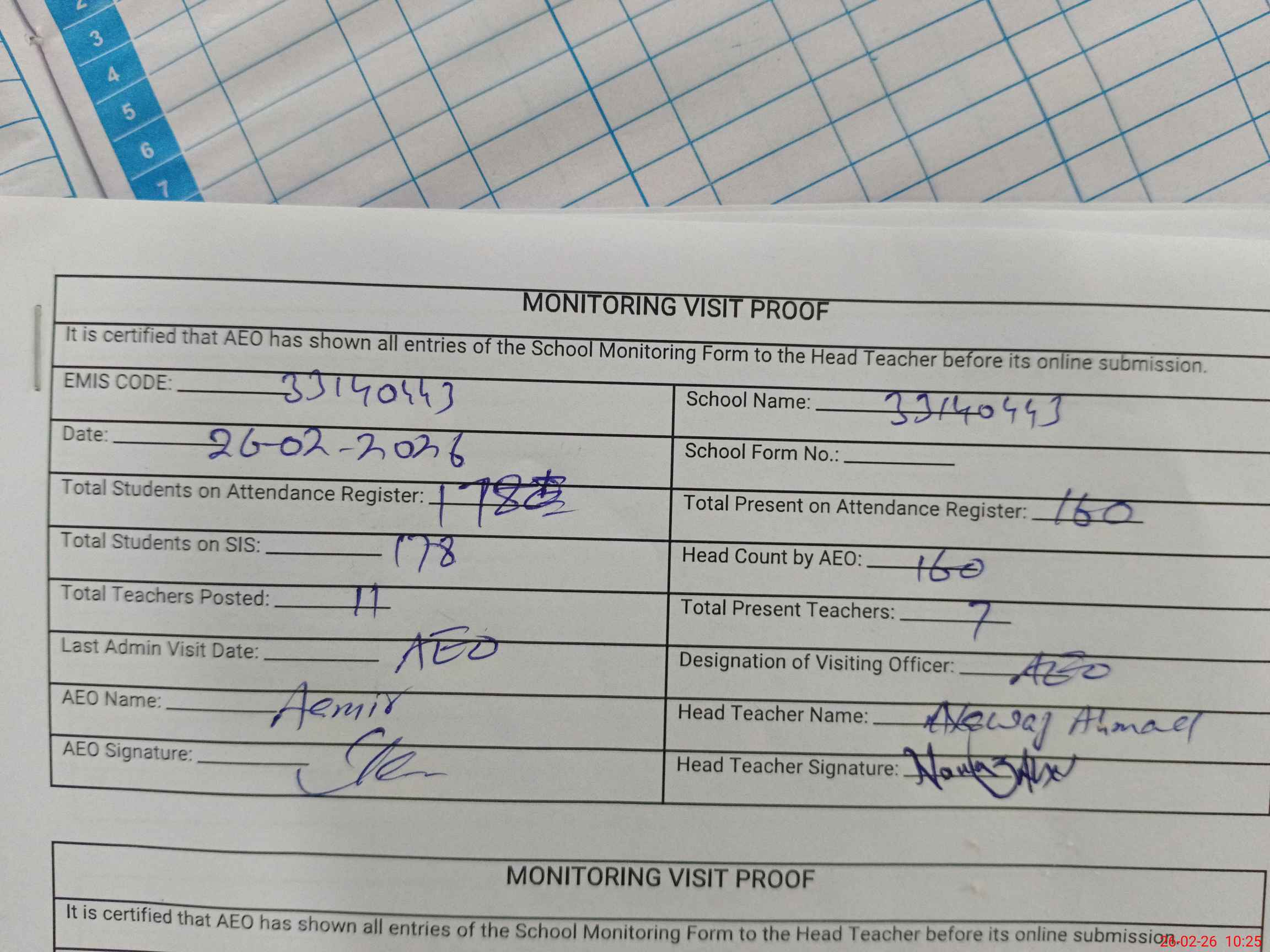 | Attendance Register | Head Teacher | MEA with School | Visit Proof |