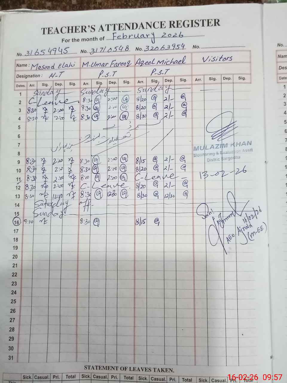 | Attendance Register | Head Teacher | MEA with School | Visit Proof |