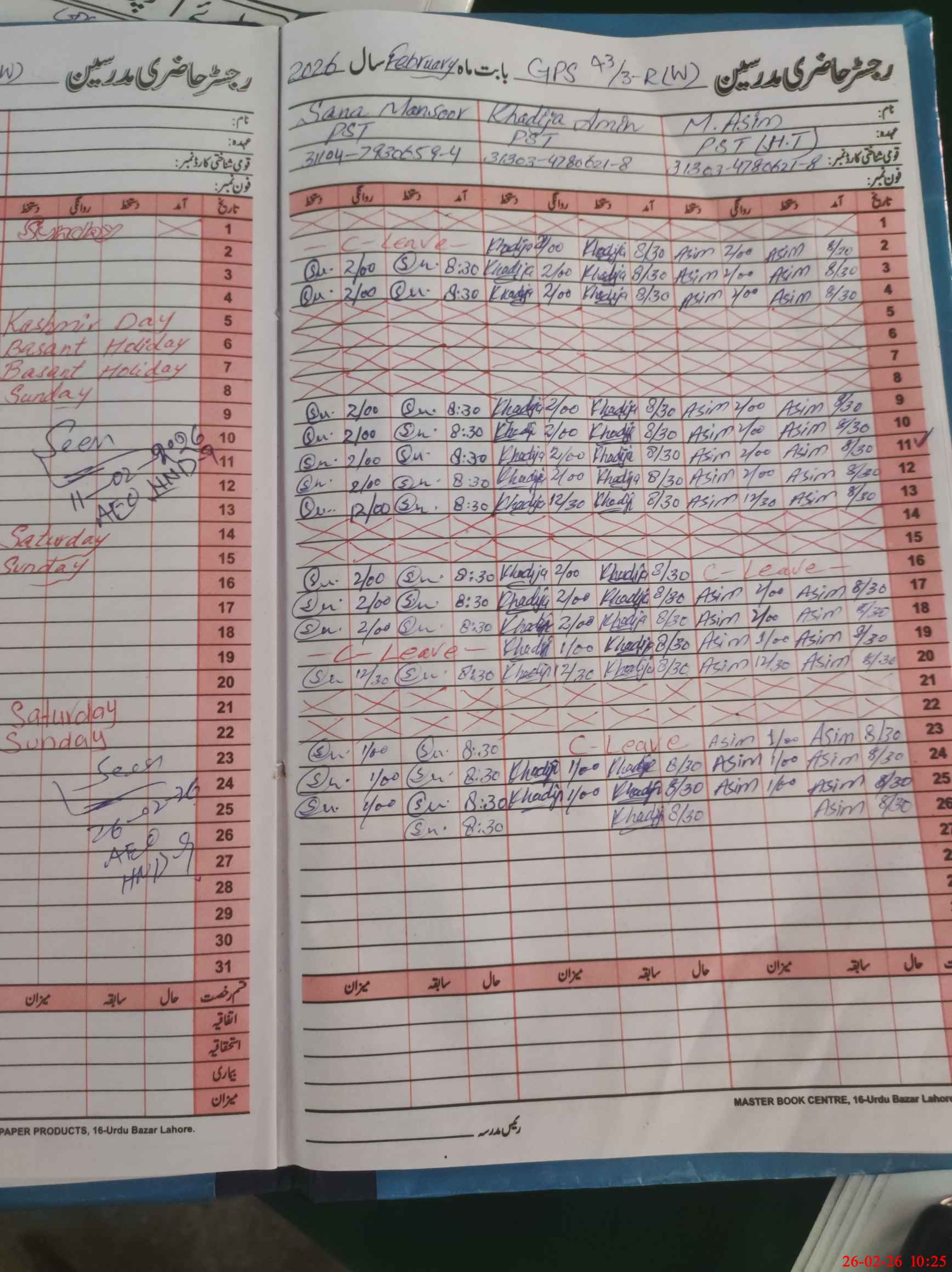 | CNIC | Full Name | Designation | R/C | Absence During Last Calender Month |