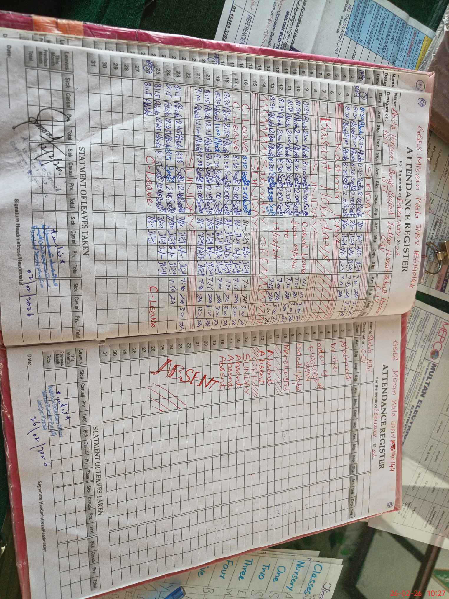 | Attendance Register | Head Teacher | MEA with School | Visit Proof |