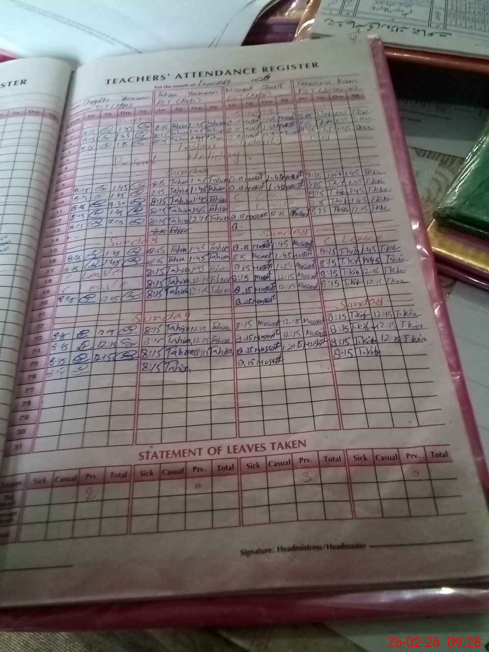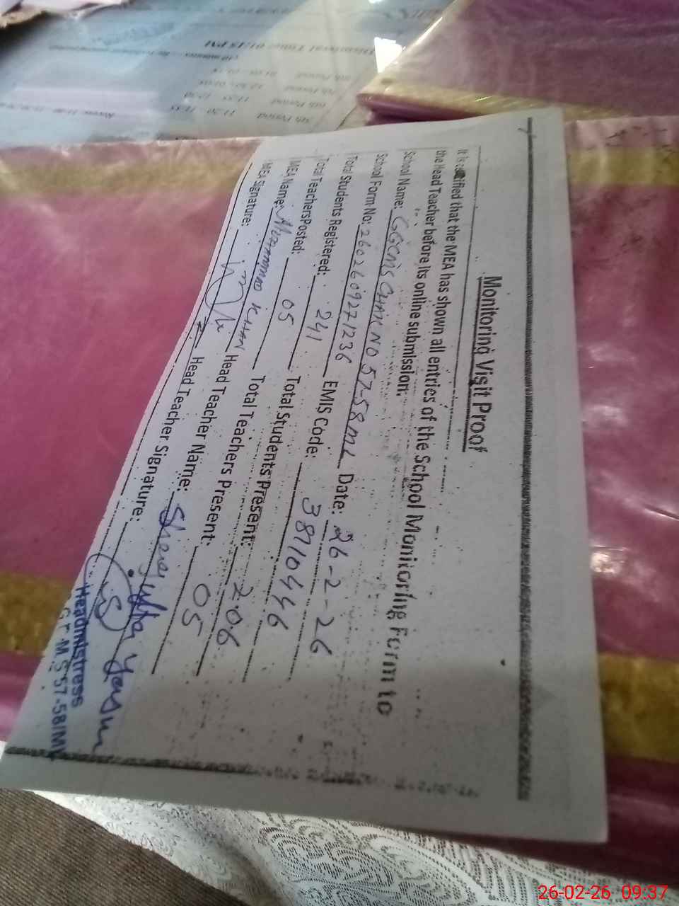 | Attendance Register | Head Teacher | MEA with School | Visit Proof |