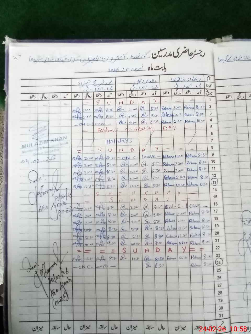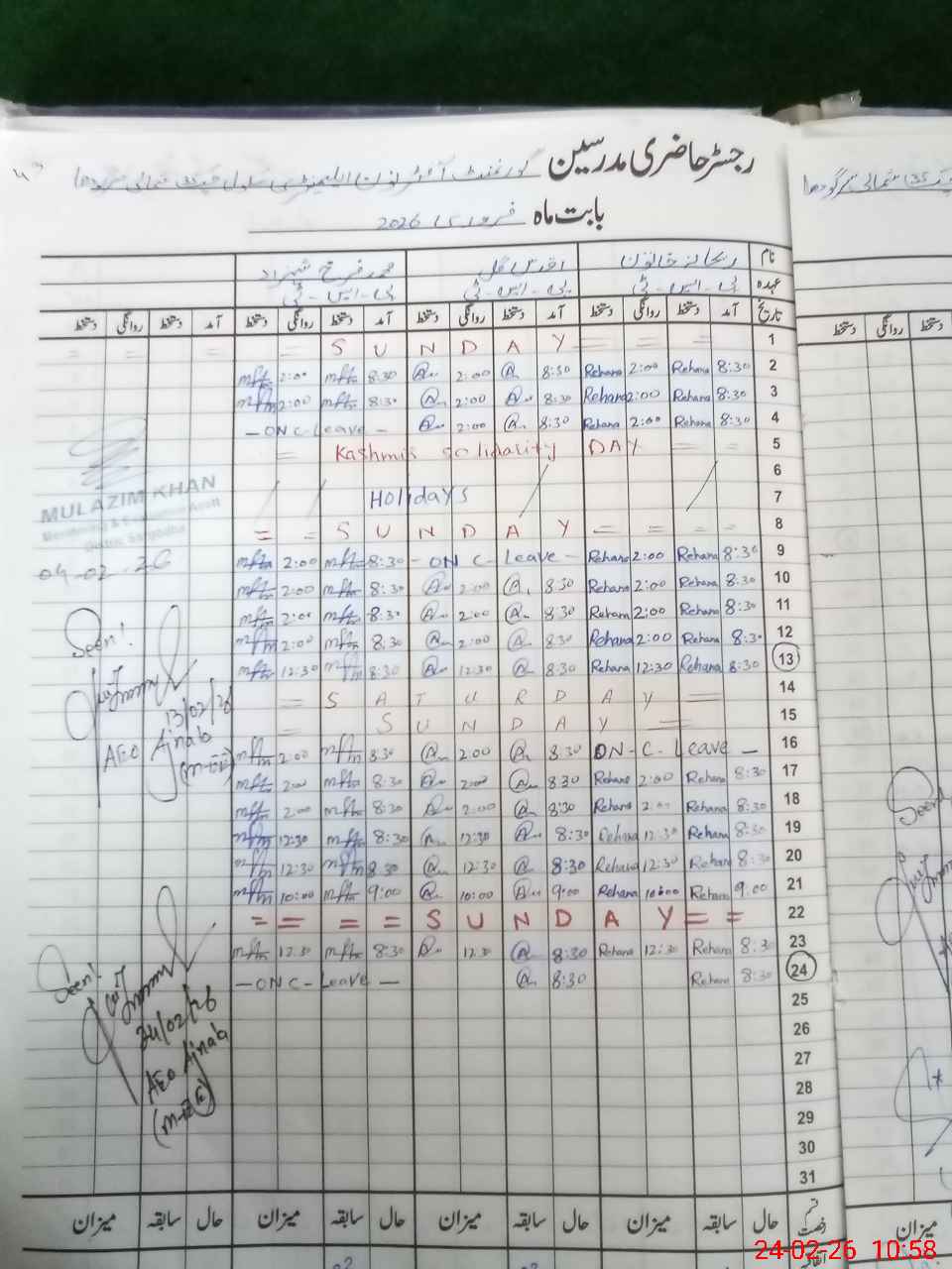 | CNIC | Full Name | Designation | R/C | Absence During Last Calender Month |