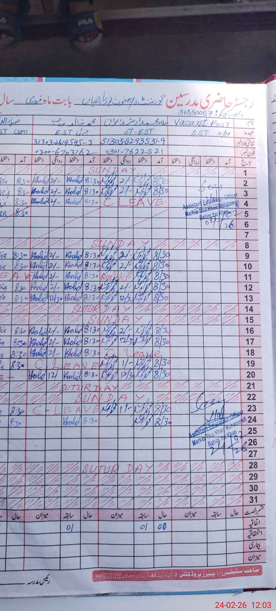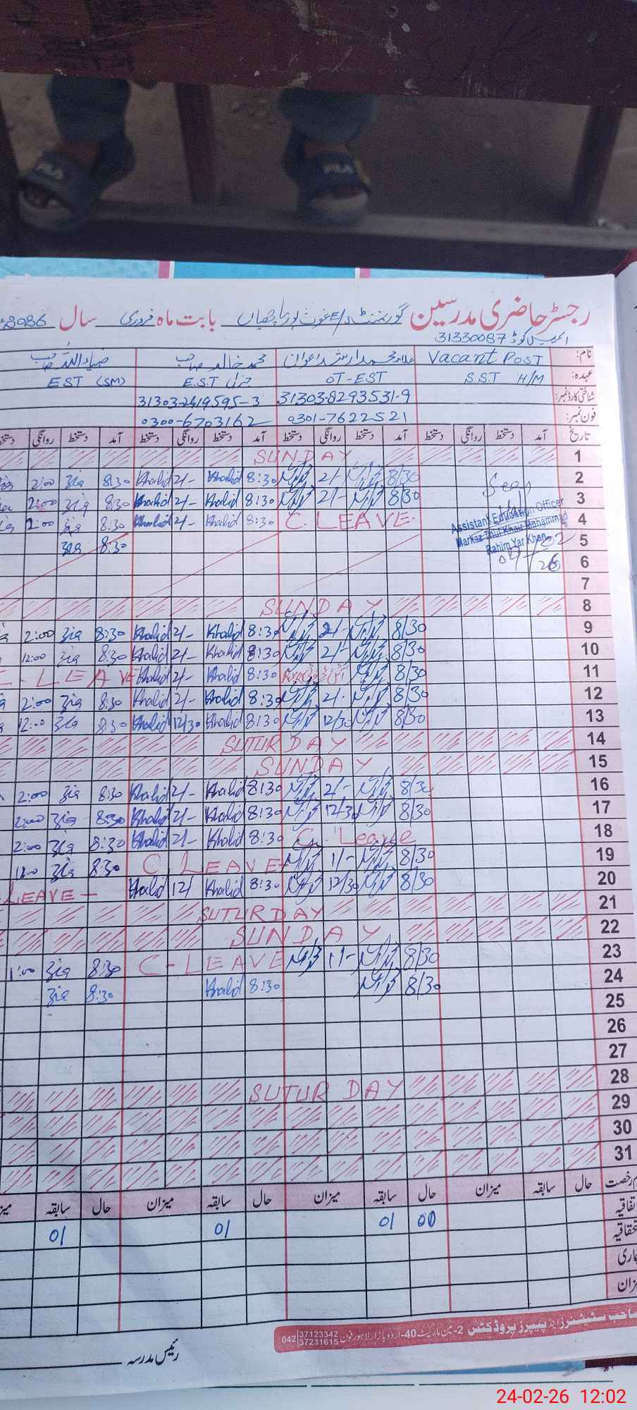 | CNIC | Full Name | Designation | R/C | Absence During Last Calender Month |