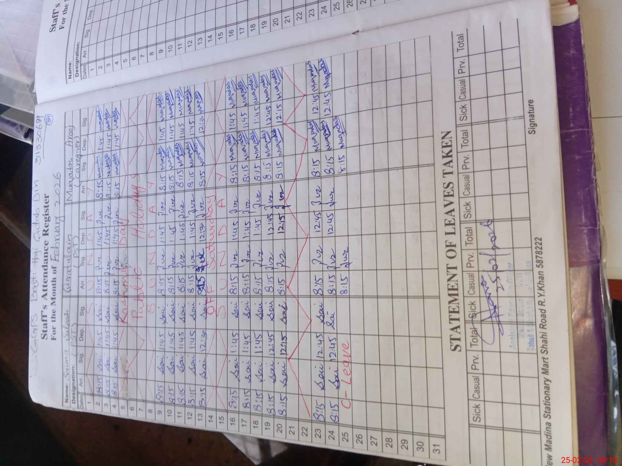 | CNIC | Full Name | Designation | R/C | Absence During Last Calender Month |