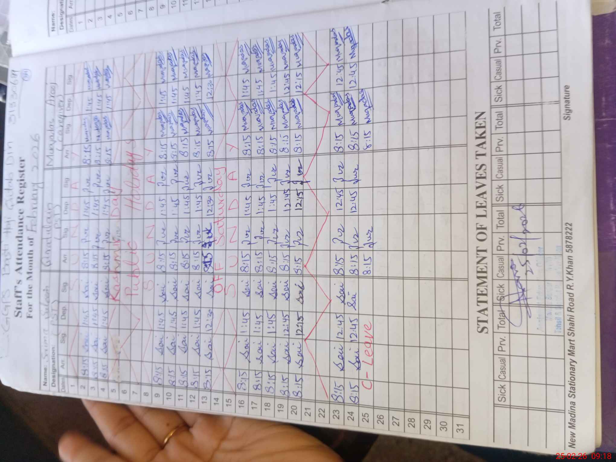 | Leave | Duty | Absent | Maternity | Medical | Ex- Pak |