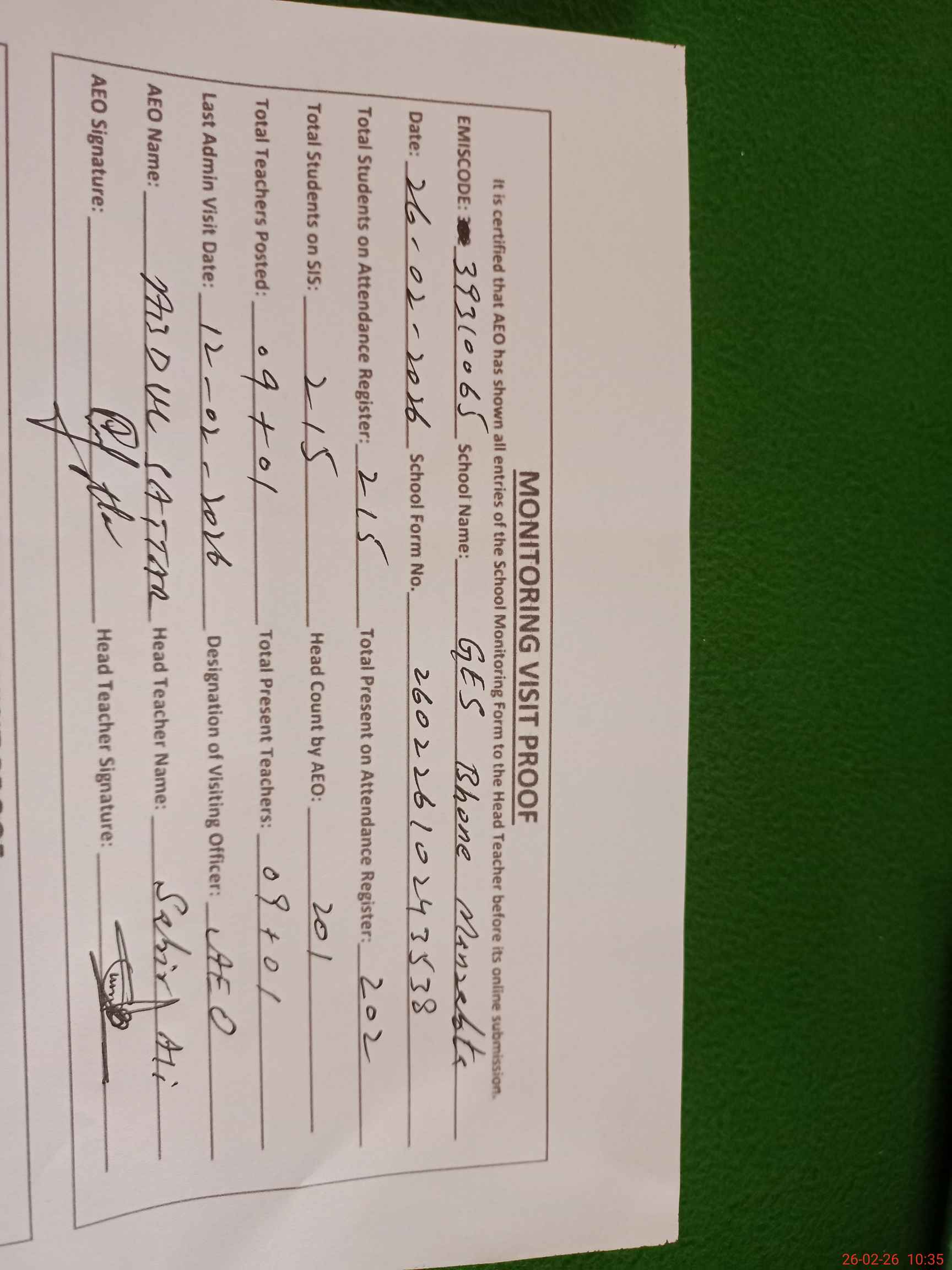 | Certified that this School was Inspected by the Undersigned MEA/DMO Today and the Information Stated Above is as Per Record. | |||||