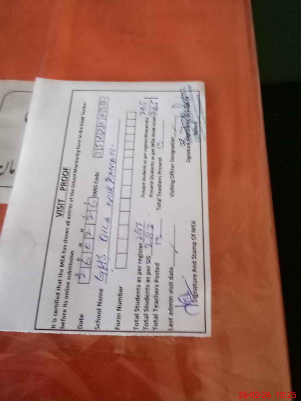 | Attendance Register | Head Teacher | MEA with School | Visit Proof |
