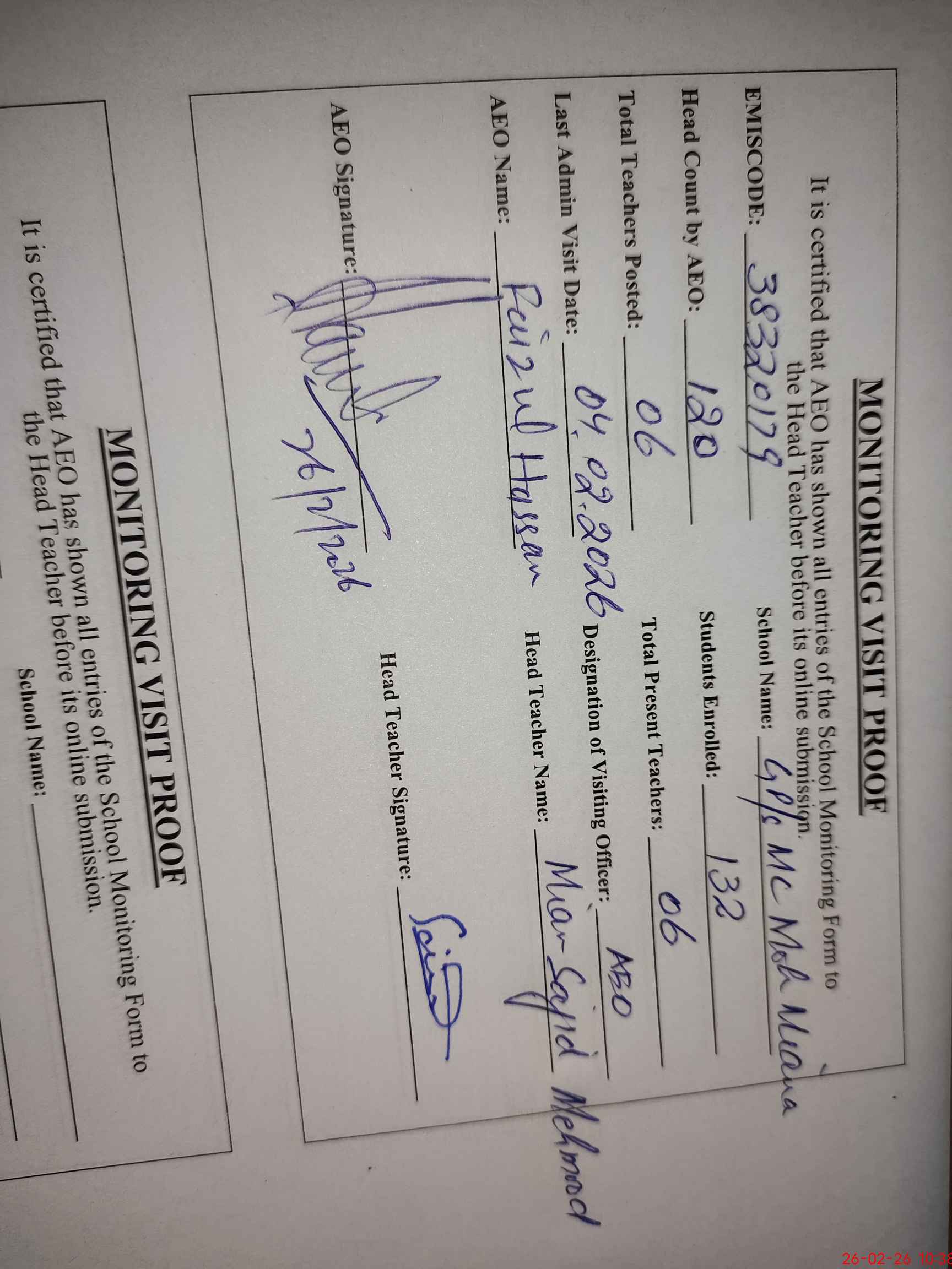 | EMIS Code: 38320179 | Name of School: GPS MC MOHALLAH MIANA | |||