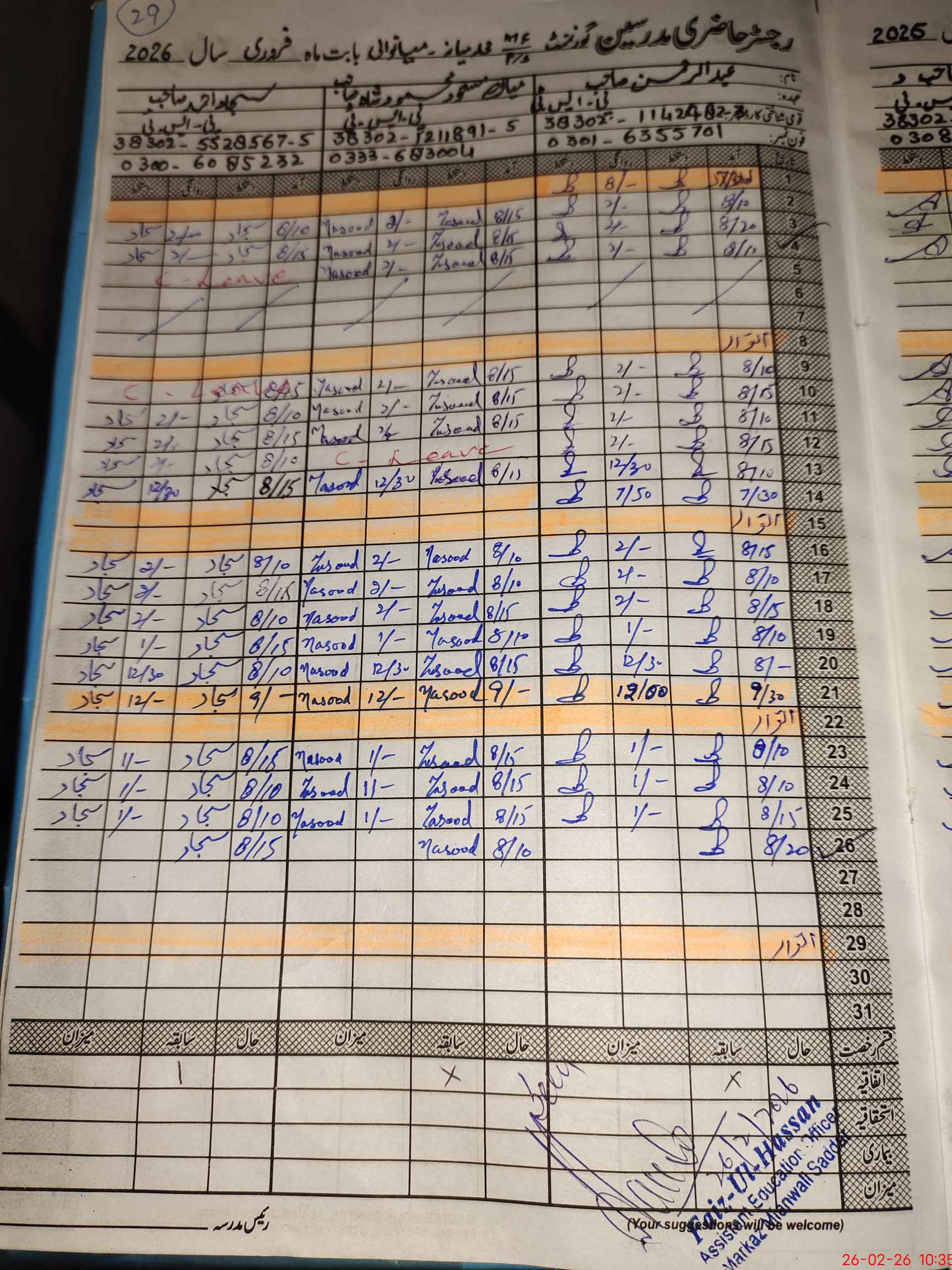 | CNIC | Full Name | Designation | R/C | Absence During Last Calender Month |