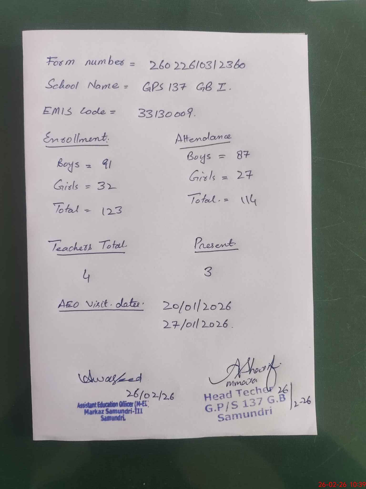 | EMIS Code: 33130009 | Name of School: GPS CHAK 137 GB I SAMUNDRI | |||