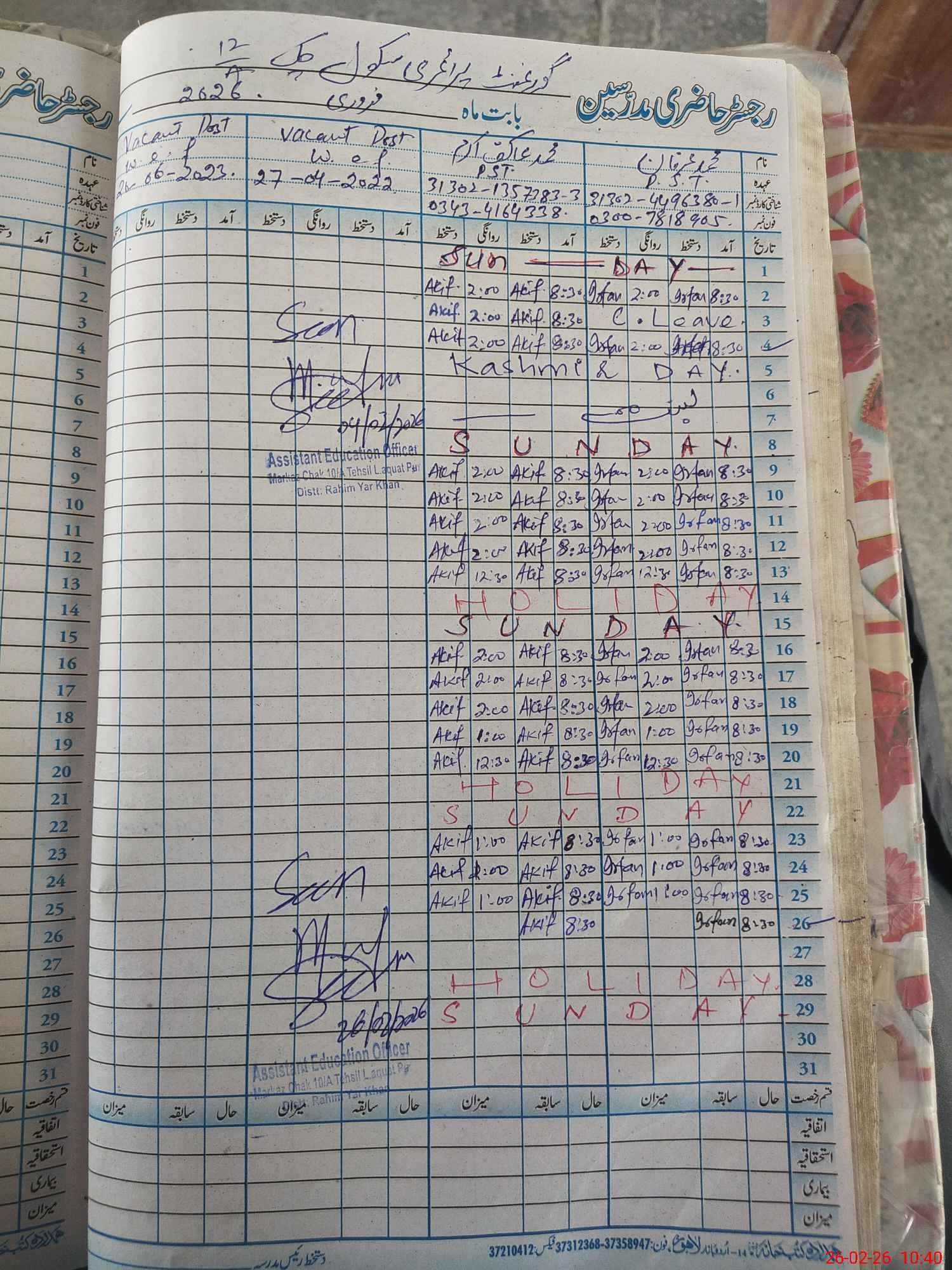 | Name: MU**** IR**** Designation: (School Headmaster's/Headmistress's) PST Phone/Cell Number: 03**** |