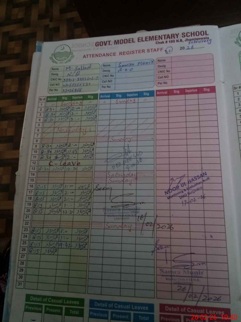 | CNIC | Full Name | Designation | R/C | Absence During Last Calender Month |