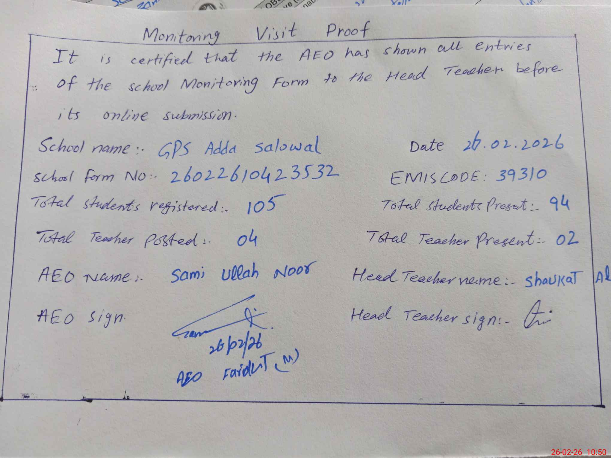 | Monitoring Date: 26-02-2026 | Start Time: 26-02-2026 10:26 AM | End Time: 26-02-2026 10:50 AM | Name of MEA: Sa**** Ul**** No**** | |
