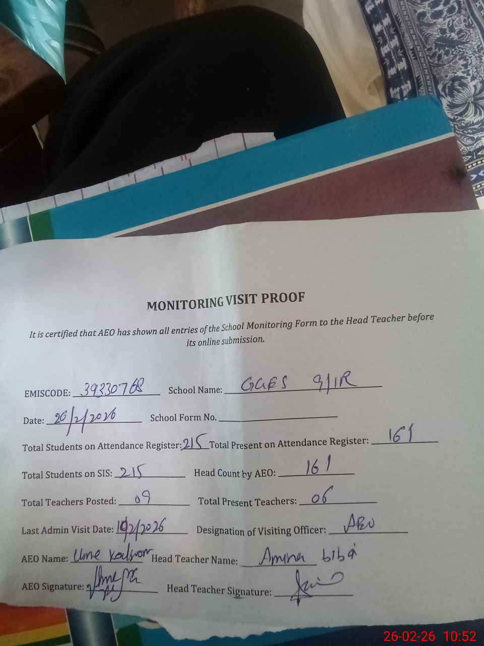 | Attendance Register | Head Teacher | MEA with School | Visit Proof |