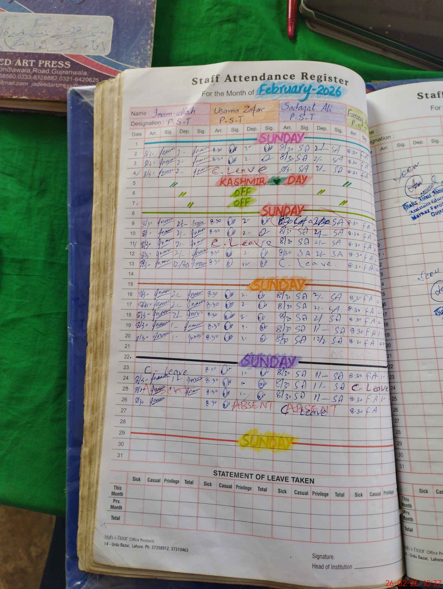 | 34**** | Us**** Za**** | PST Arts | Regular | 0 | 0 | 0 | 0 | 0 | 0 | 0 | 0 | 0 | Absent (Un-Authorized) |