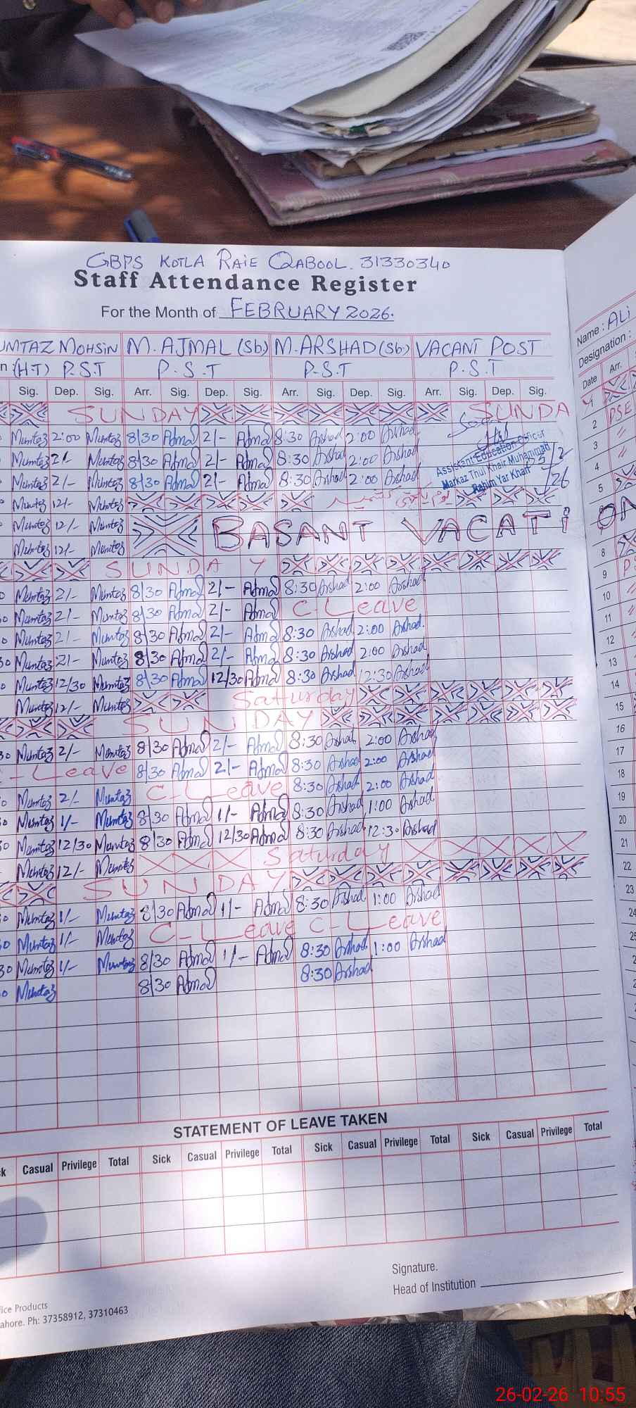 | CNIC | Full Name | Designation | R/C | Absence During Last Calender Month |