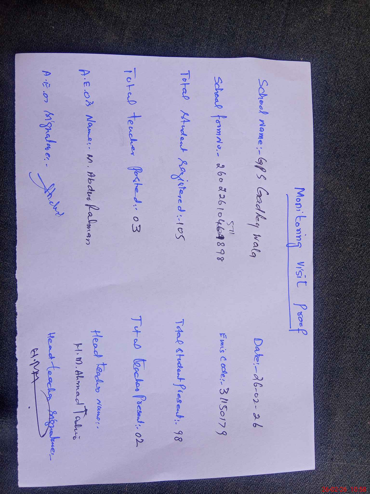 | EMIS Code: 31150179 | Name of School: GPS GADHEY WALA | |||